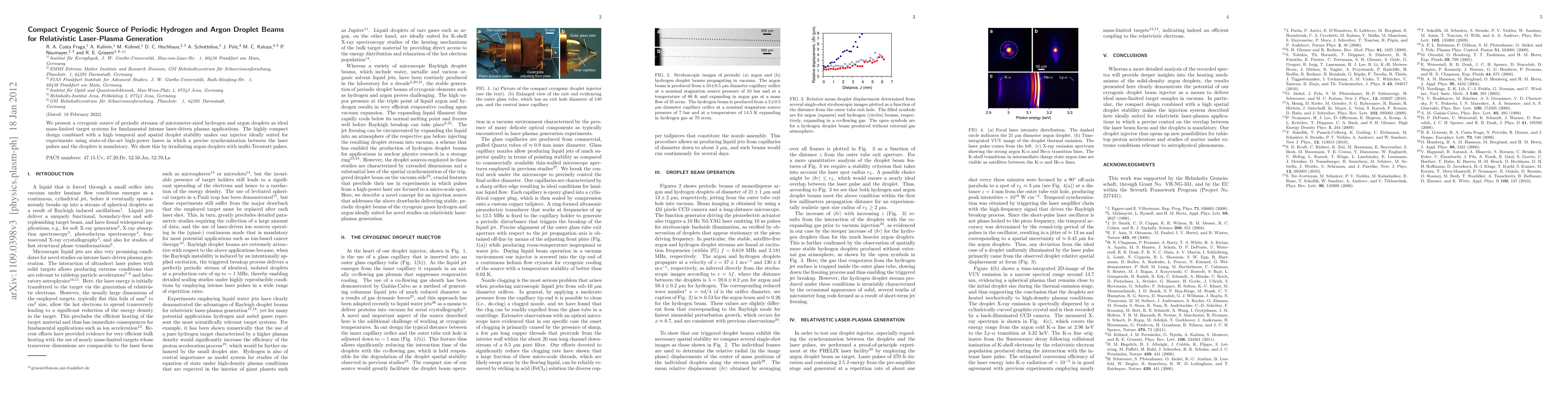 This paper introduces a compact cryogenic source generating stable, periodic micrometer-sized hydrogen and argon droplet beams for use in relativistic laser-plasma experiments. The design ensures precise synchronization between laser pulses and droplet streams, demonstrated by irradiating argon droplets with multi-Terawatt laser pulses.