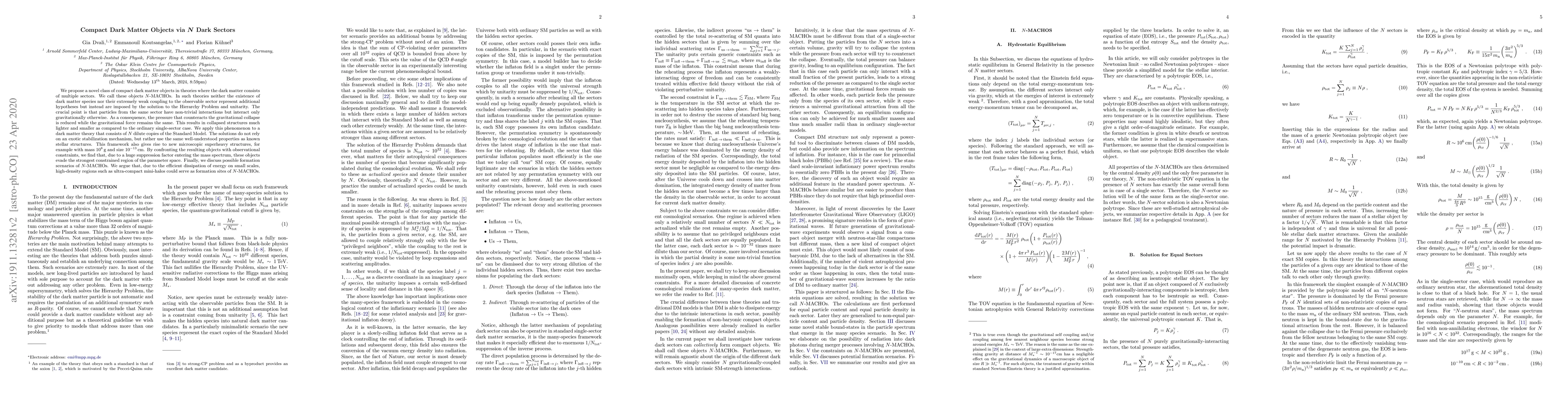 We propose a novel class of compact dark matter objects in theories where the dark matter consists of multiple sectors. We call these objects $N$-MACHOs. In such theories neither the existence of dark matter species nor their extremely weak coupling to the observable sector represent additional hypotheses but instead are imposed by the solution to the Hierarchy Problem and unitarity. The crucial point is that particles from the same sector have non-trivial interactions but interact only gravitationally otherwise. As a consequence, the pressure that counteracts the gravitational collapse is reduced while the gravitational force remains the same. This results in collapsed structures much lighter and smaller as compared to the ordinary single-sector case. We apply this phenomenon to a dark matter theory that consists of $N$ dilute copies of the Standard Model. The solutions do not rely on an exotic stabilization mechanism, but rather use the same well-understood properties as known stellar structures. This framework also gives rise to new microscopic superheavy structures, for example with mass $10^8\,$g and size $10^{-13}\,$cm. By confronting the resulting objects with observational constraints, we find that, due to a huge suppression factor entering the mass spectrum, these objects evade the strongest constrained region of the parameter space. Finally, we discuss possible formation scenarios of $N$-MACHOs. We argue that, due to the efficient dissipation of energy on small scales, high-density regions such as ultra-compact mini-halos could serve as formation sites of $N$-MACHOs.