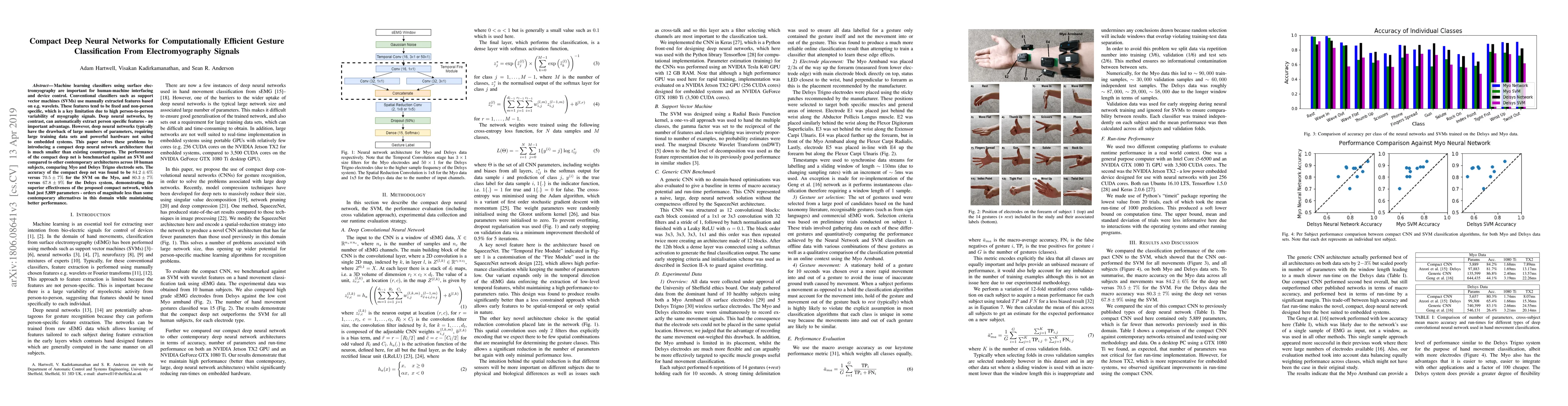 A compact deep neural network architecture outperforms traditional machine learning classifiers in gesture classification from electromyography signals, achieving 84.2% accuracy with only 5,889 parameters.