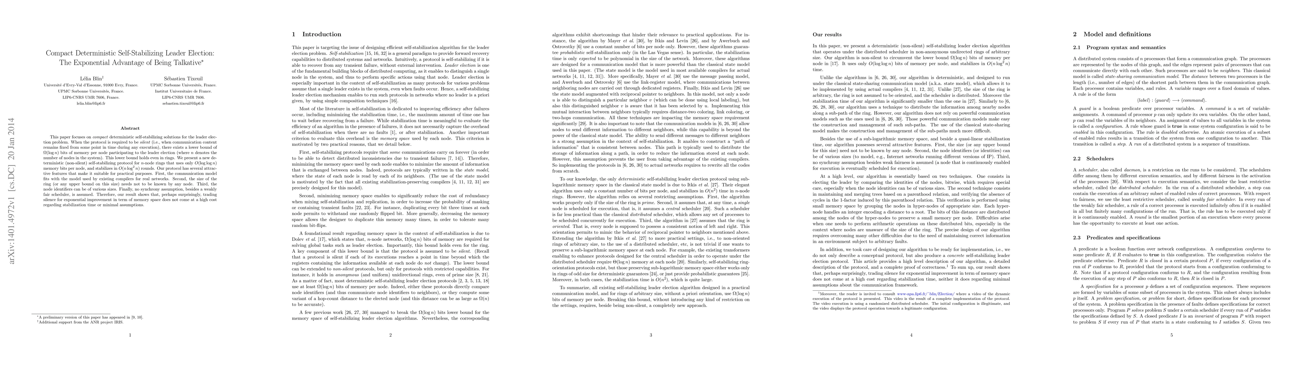 This paper focuses on compact deterministic self-stabilizing solutions for the leader election problem. When the protocol is required to be \emph{silent} (i.e., when communication content remains fixed from some point in time during any execution), there exists a lower bound of Omega(\log n) bits of memory per node participating to the leader election (where n denotes the number of nodes in the system). This lower bound holds even in rings. We present a new deterministic (non-silent) self-stabilizing protocol for n-node rings that uses only O(\log\log n) memory bits per node, and stabilizes in O(n\log^2 n) rounds. Our protocol has several attractive features that make it suitable for practical purposes. First, the communication model fits with the model used by existing compilers for real networks. Second, the size of the ring (or any upper bound on this size) needs not to be known by any node. Third, the node identifiers can be of various sizes. Finally, no synchrony assumption, besides a weakly fair scheduler, is assumed. Therefore, our result shows that, perhaps surprisingly, trading silence for exponential improvement in term of memory space does not come at a high cost regarding stabilization time or minimal assumptions.