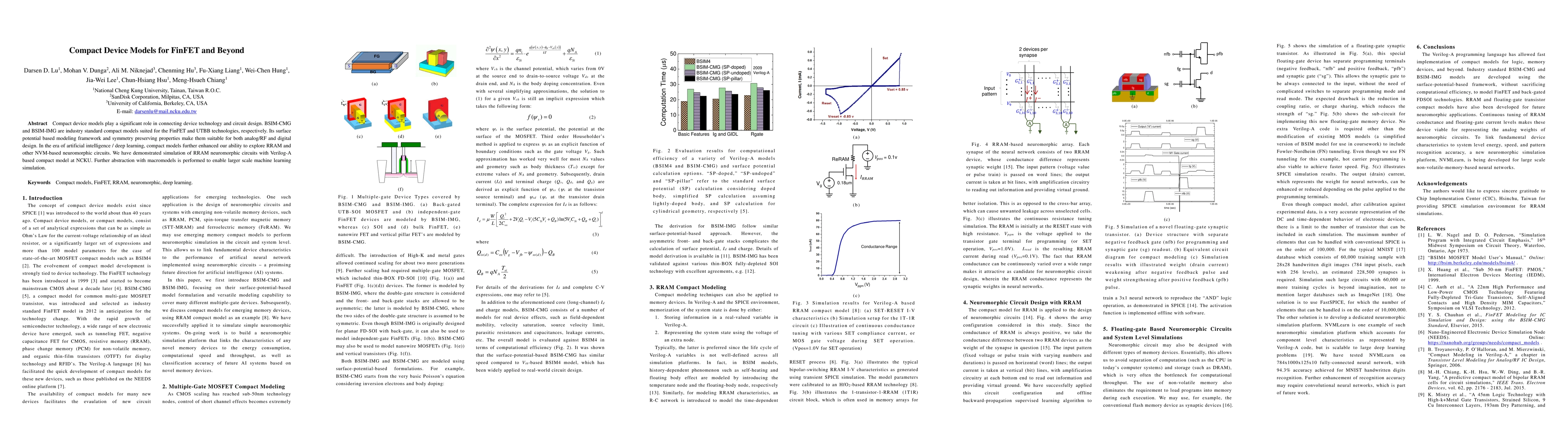 Compact device models play a significant role in connecting device technology and circuit design. BSIM-CMG and BSIM-IMG are industry standard compact models suited for the FinFET and UTBB technologies, respectively. Its surface potential based modeling framework and symmetry preserving properties make them suitable for both analog/RF and digital design. In the era of artificial intelligence / deep learning, compact models further enhanced our ability to explore RRAM and other NVM-based neuromorphic circuits. We have demonstrated simulation of RRAM neuromorphic circuits with Verilog-A based compact model at NCKU. Further abstraction with macromodels is performed to enable larger scale machine learning simulation.