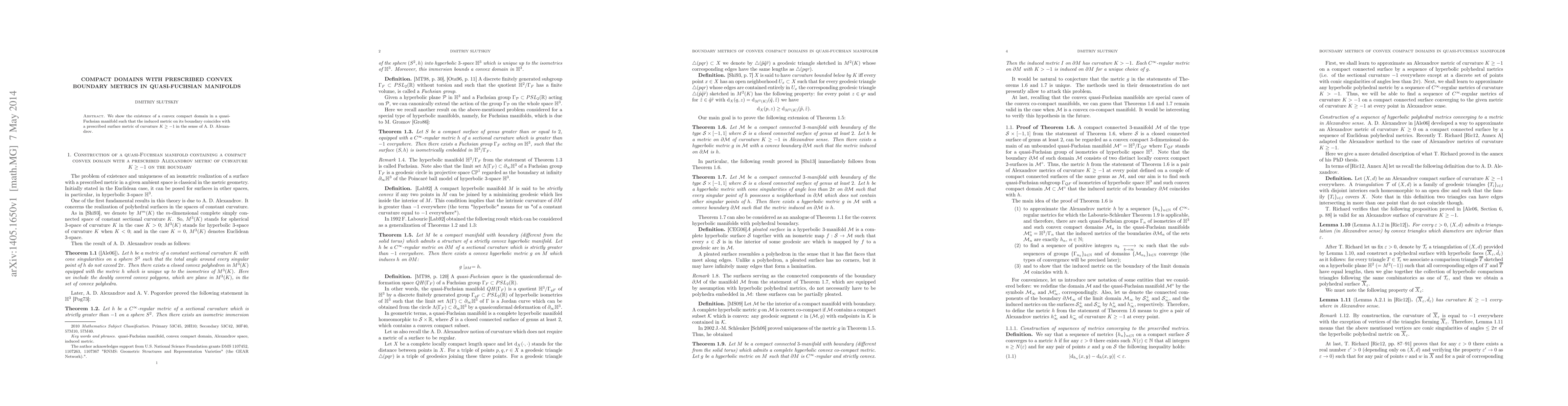 We show the existence of a convex compact domain in a quasi-Fuchsian manifold such that the induced metric on its boundary coincides with a prescribed surface metric of curvature $K\geq-1$ in the sense of A. D. Alexandrov.