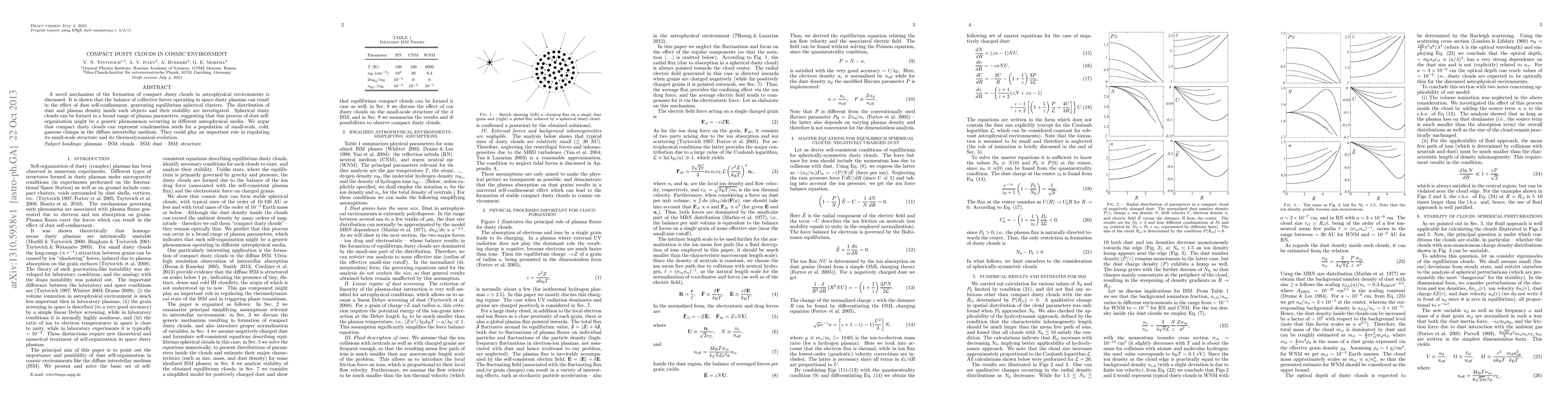 This research introduces a new formation mechanism for compact dusty clouds in space, driven by collective forces causing dust self-confinement. These spherical clusters can exist across various plasma parameters, potentially acting as seeds for small, cold gas clumps in interstellar medium, influencing its structure and evolution.
