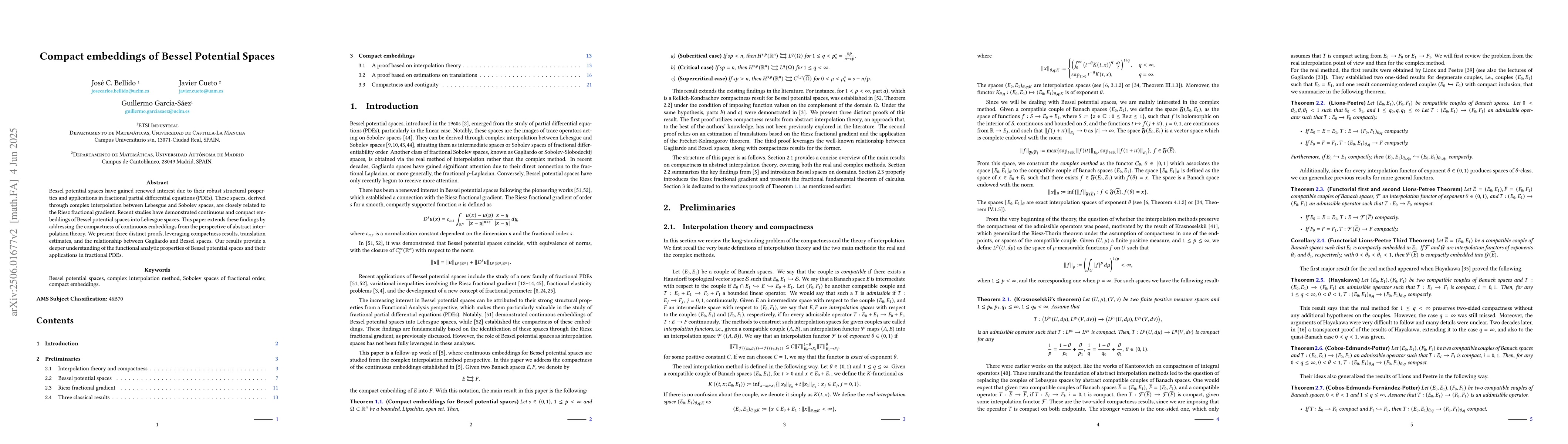 The paper's main contribution lies in its detailed examination of compact embeddings of Bessel potential spaces, offering new perspectives via abstract interpolation theory and distinct proof methods.