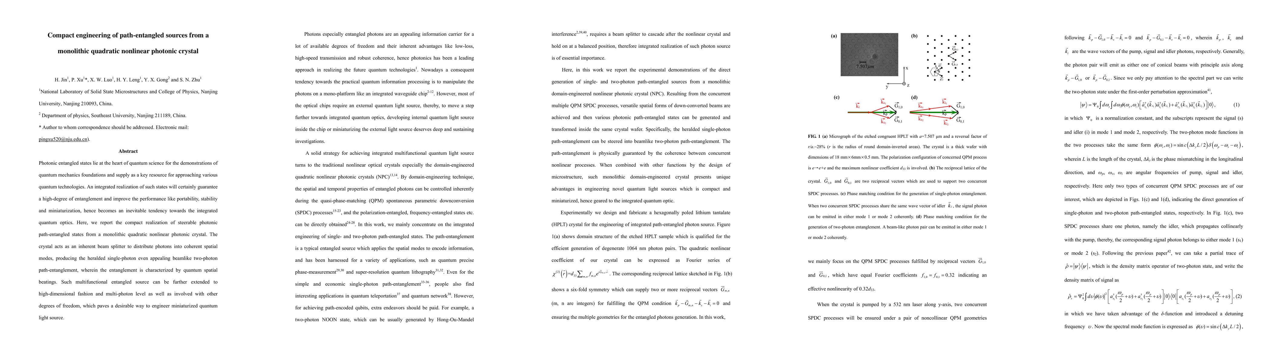 This paper reports the creation of compact, steerable photonic path-entangled states using a monolithic quadratic nonlinear photonic crystal, which inherently acts as a beam splitter. The crystal enables the production of heralded single-photon and two-photon path-entanglement, facilitating miniaturized, integrated quantum light sources.