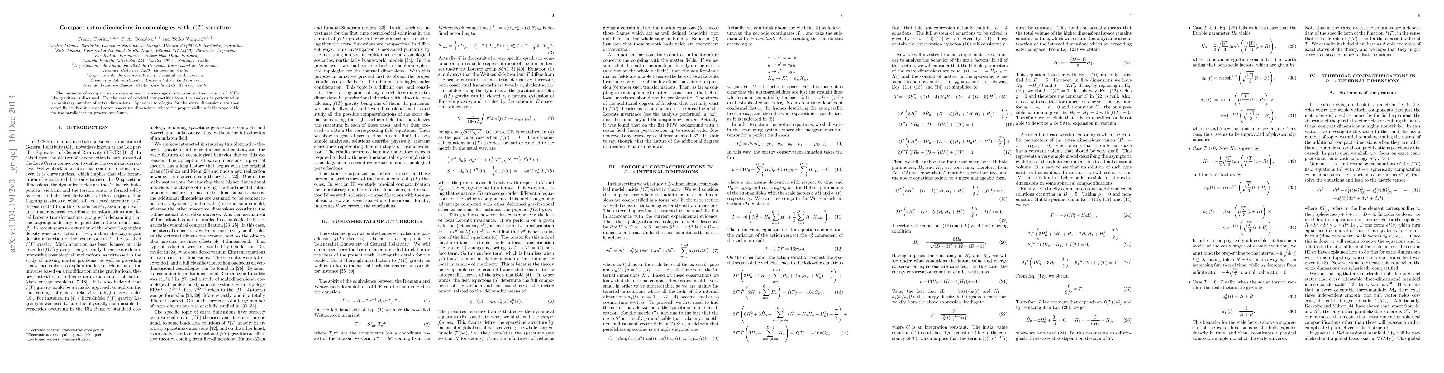 This paper explores the implications of compact extra dimensions within cosmological models based on f(T)-like gravities, focusing on toroidal compactifications in multiple dimensions and spherical topologies specifically in six and seven dimensions, identifying the relevant vielbein fields for parallelization.