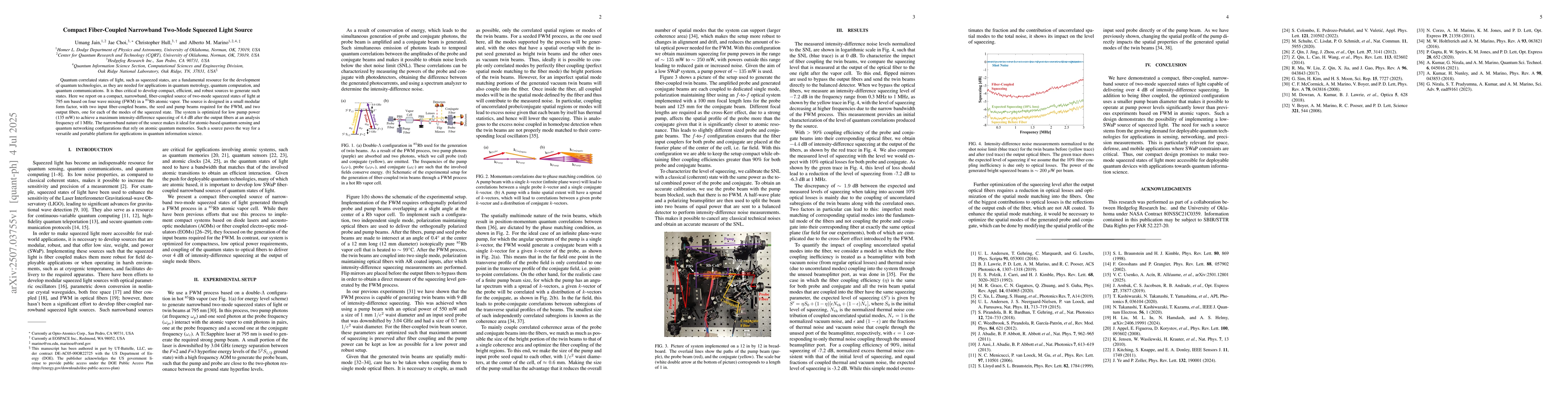 Quantum correlated states of light, such as squeezed states, are a fundamental resource for the development of quantum technologies, as they are needed for applications in quantum metrology, quantum computation, and quantum communications. It is thus critical to develop compact, efficient, and robust sources to generate such states. Here we report on a compact, narrowband, fiber-coupled source of two-mode squeezed states of light at 795 nm based on four wave mixing (FWM) in a $^{85}$Rb atomic vapor. The source is designed in a small modular form factor, with two input fiber-coupled beams, the seed and pump beams required for the FWM, and two output fibers, one for each of the modes of the squeezed state. The system is optimized for low pump power (135 mW) to achieve a maximum intensity-difference squeezing of 4.4 dB after the output fibers at an analysis frequency of 1 MHz. The narrowband nature of the source makes it ideal for atomic-based quantum sensing and quantum networking configurations that rely on atomic quantum memories. Such a source paves the way for a versatile and portable platform for applications in quantum information science.