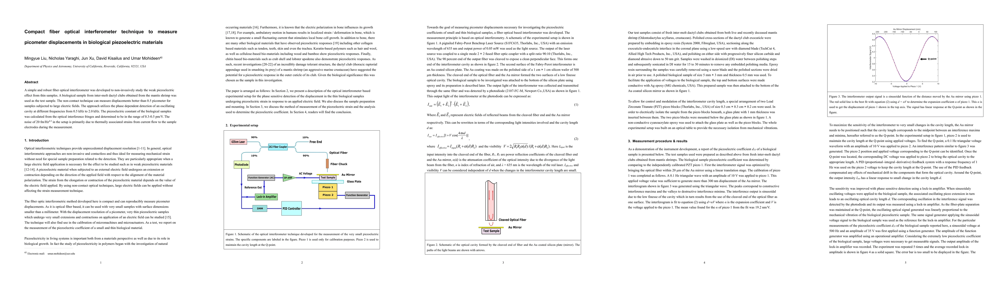 A compact fiber optical interferometer was developed to non-invasively measure the piezoelectric effect in thin biological samples, specifically from mantis shrimp dactyl clubs. The technique utilizes phase-dependent detection of an oscillating cavity at frequencies between 0.5 kHz and 2.0 kHz.