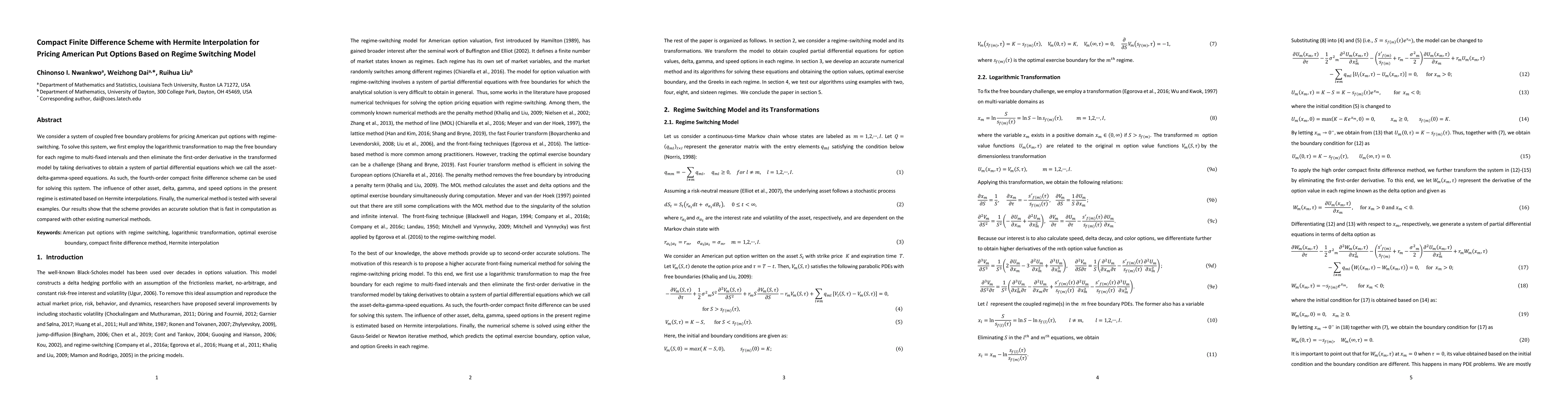 This paper proposes a compact finite difference scheme with Hermite interpolation for pricing American put options based on a regime-switching model. The method transforms the free boundary problem into a system of asset-delta-gamma-speed equations, which are solved using a fourth-order scheme, demonstrating accuracy and computational efficiency compared to existing methods.