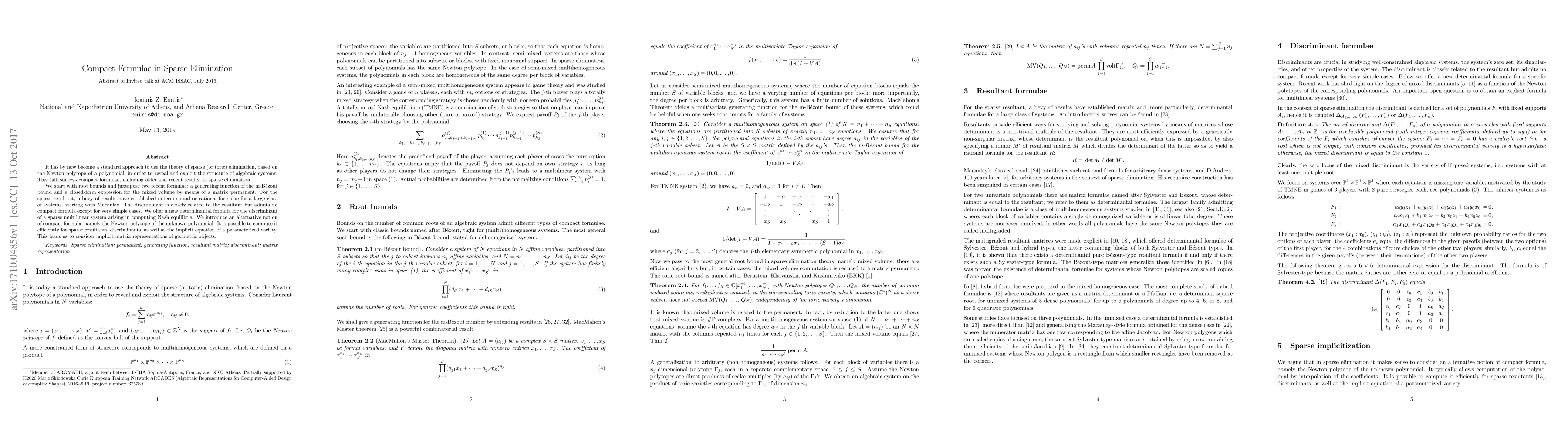 It has by now become a standard approach to use the theory of sparse (or toric) elimination, based on the Newton polytope of a polynomial, in order to reveal and exploit the structure of algebraic systems. This talk surveys compact formulae, including older and recent results, in sparse elimination. We start with root bounds and juxtapose two recent formulae: a generating function of the m-B{\'e}zout bound and a closed-form expression for the mixed volume by means of a matrix permanent. For the sparse resultant, a bevy of results have established determinantal or rational formulae for a large class of systems, starting with Macaulay. The discriminant is closely related to the resultant but admits no compact formula except for very simple cases. We offer a new determinantal formula for the discriminant of a sparse multilinear system arising in computing Nash equilibria. We introduce an alternative notion of compact formula, namely the Newton polytope of the unknown polynomial. It is possible to compute it efficiently for sparse resultants, discriminants, as well as the implicit equation of a parameterized variety. This leads us to consider implicit matrix representations of geometric objects.