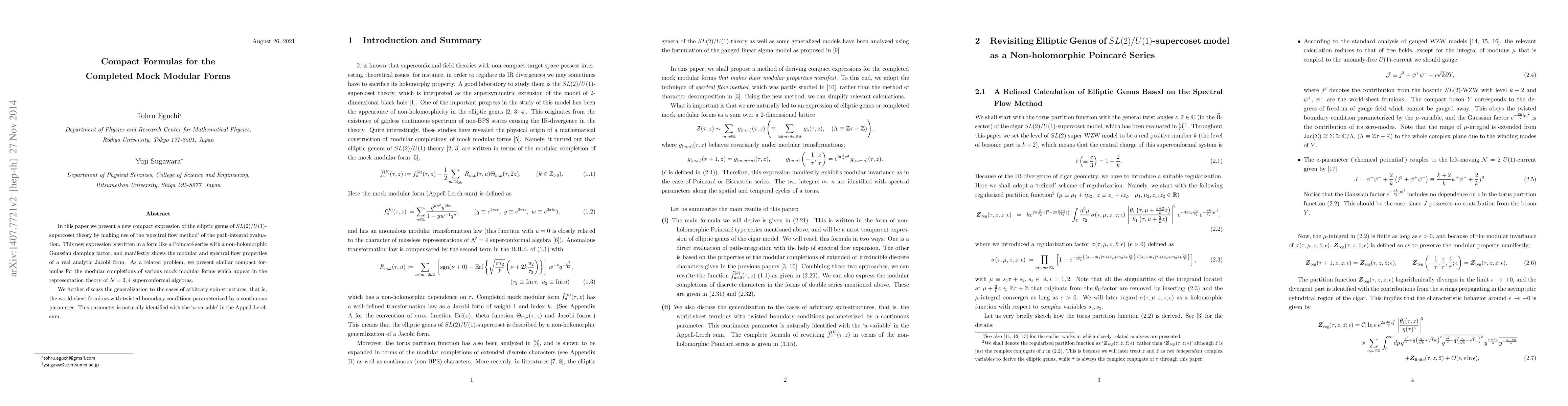This paper introduces compact expressions for the elliptic genus of SL(2)/U(1)-supercoset theory using the spectral flow method, presenting a new form resembling a Poincare series with a non-holomorphic Gaussian damping factor. It also provides similar compact formulas for modular completions of various mock modular forms linked to N=2,4 superconformal algebras, and generalizes the results to arbitrary spin-structures.