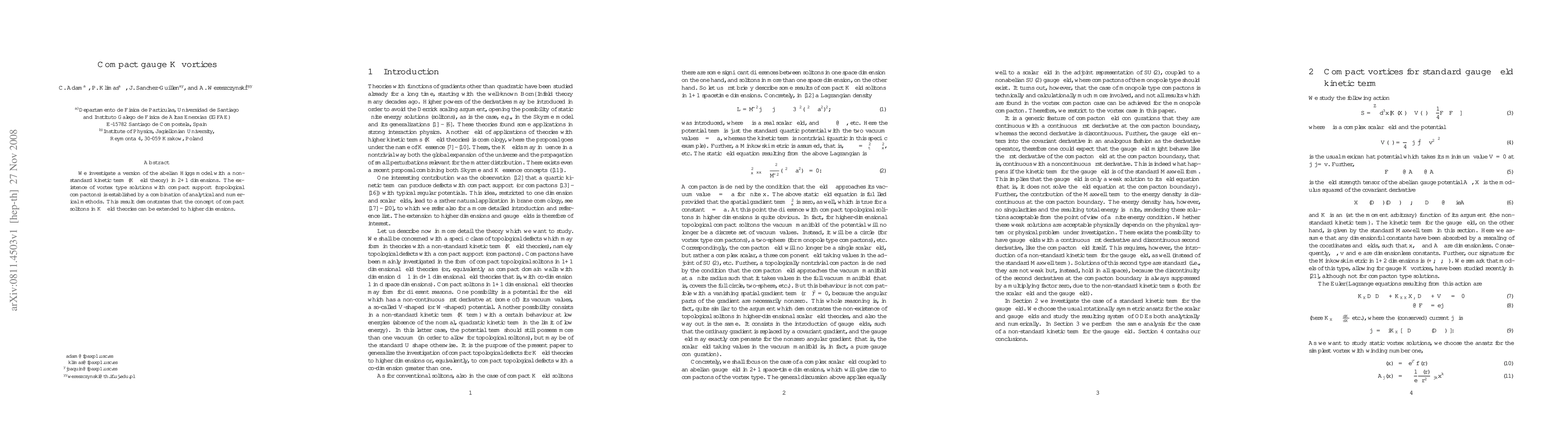 We investigate a version of the abelian Higgs model with a non-standard kinetic term (K field theory) in 2+1 dimensions. The existence of vortex type solutions with compact support (topological compactons) is established by a combination of analytical and numerical methods. This result demonstrates that the concept of compact solitons in K field theories can be extended to higher dimensions.