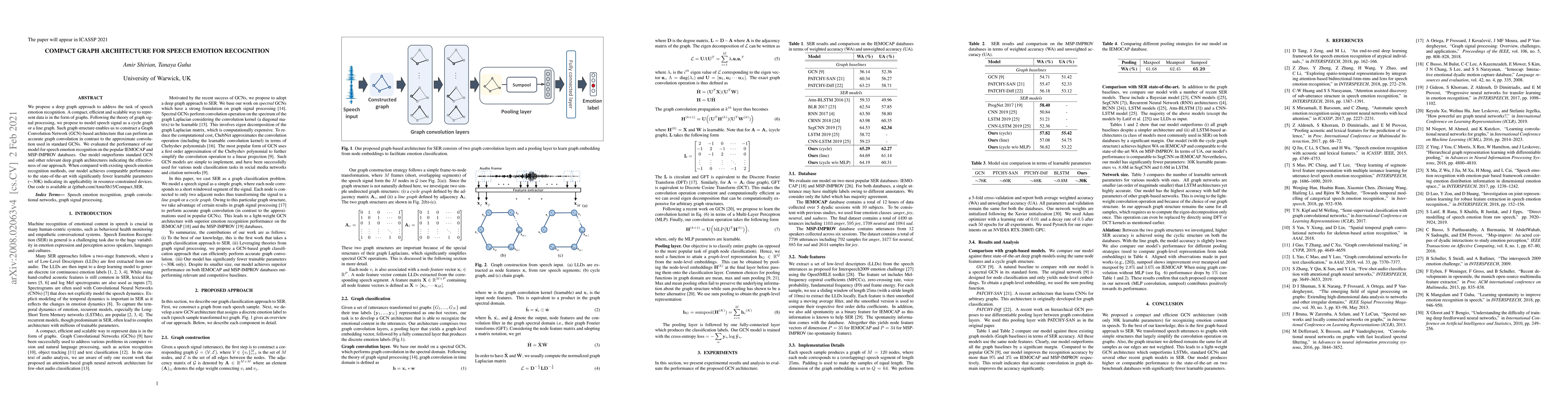 This paper proposes a compact graph architecture using a Graph Convolution Network (GCN) for speech emotion recognition, outperforming standard GCNs and other deep graph models while requiring fewer parameters, making it suitable for resource-constrained devices. The model was tested on IEMOCAP and MSP-IMPROV databases, achieving state-of-the-art performance.