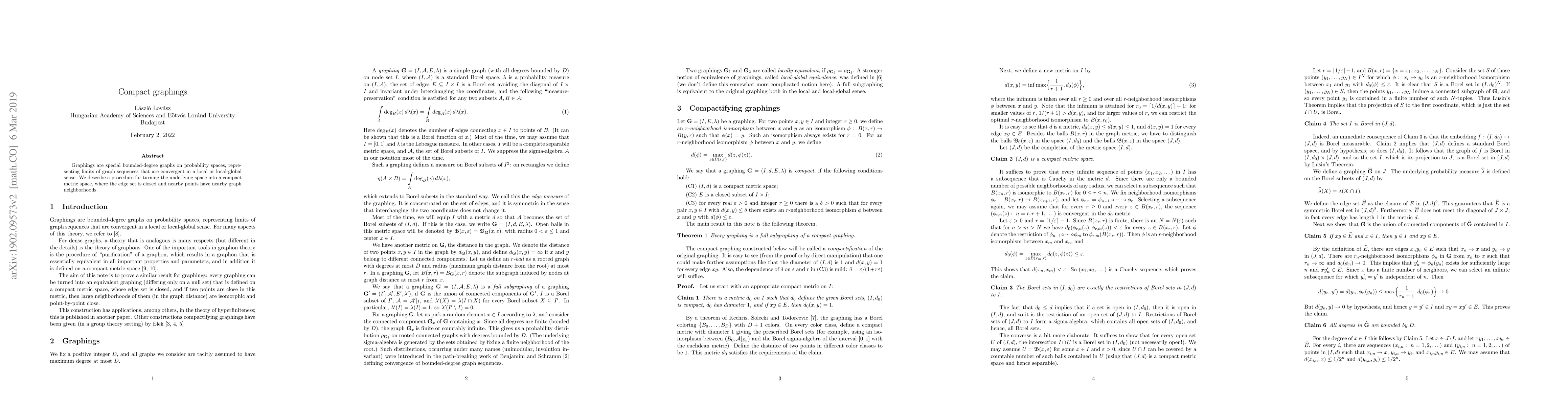 Summary: This paper introduces a method to transform the underlying space of graphings into a compact metric space, ensuring that the edge set remains closed and that nearby points share similar graph neighborhoods, facilitating the study of graph sequences that converge locally or globally.