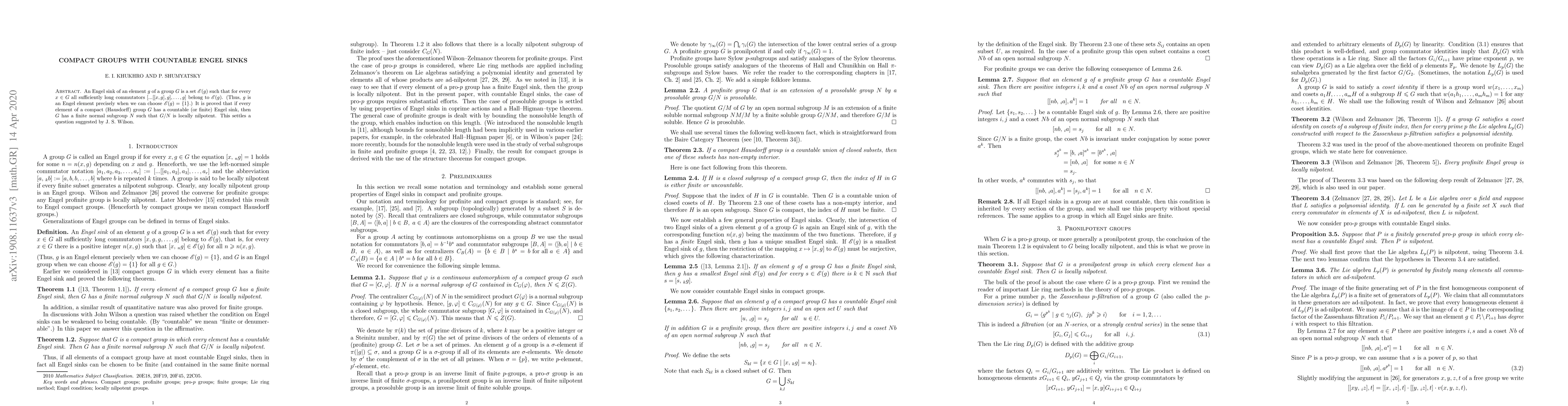 An Engel sink of an element $g$ of a group $G$ is a set ${\mathscr E}(g)$ such that for every $x\in G$ all sufficiently long commutators $[...[[x,g],g],\dots ,g]$ belong to ${\mathscr E}(g)$. (Thus, $g$ is an Engel element precisely when we can choose ${\mathscr E}(g)=\{ 1\}$.) It is proved that if every element of a compact (Hausdorff) group $G$ has a countable (or finite) Engel sink, then $G$ has a finite normal subgroup $N$ such that $G/N$ is locally nilpotent. This settles a question suggested by J. S. Wilson.