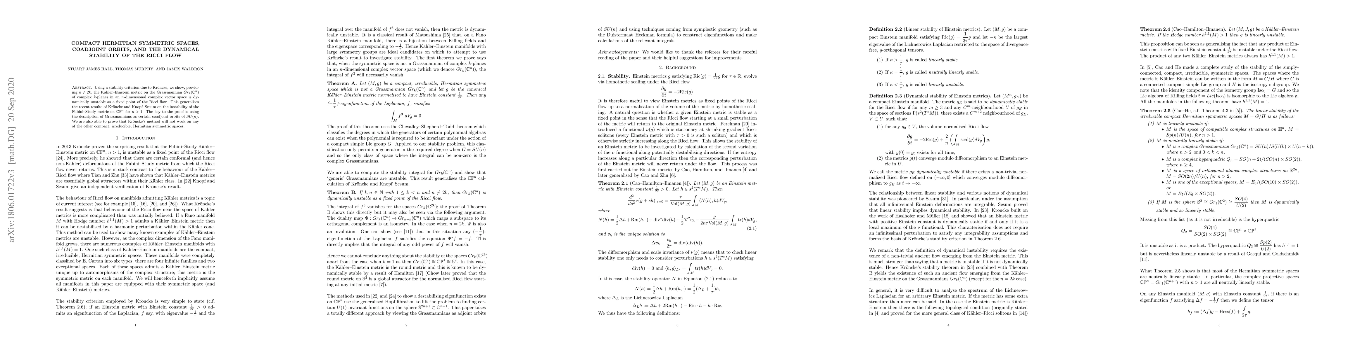 Using a stability criterion due to Kr\"oncke, we show, providing ${n\neq 2k}$, the K\"ahler--Einstein metric on the Grassmannian $Gr_{k}(\mathbb{C}^{n})$ of complex $k$-planes in an $n$-dimensional complex vector space is dynamically unstable as a fixed point of the Ricci flow. This generalises the recent results of Kr\"oncke and Knopf--Sesum on the instability of the Fubini--Study metric on $\mathbb{CP}^{n}$ for $n>1$. The key to the proof is using the description of Grassmannians as certain coadjoint orbits of $SU(n)$. We are also able to prove that Kr\"oncke's method will not work on any of the other compact, irreducible, Hermitian symmetric spaces.