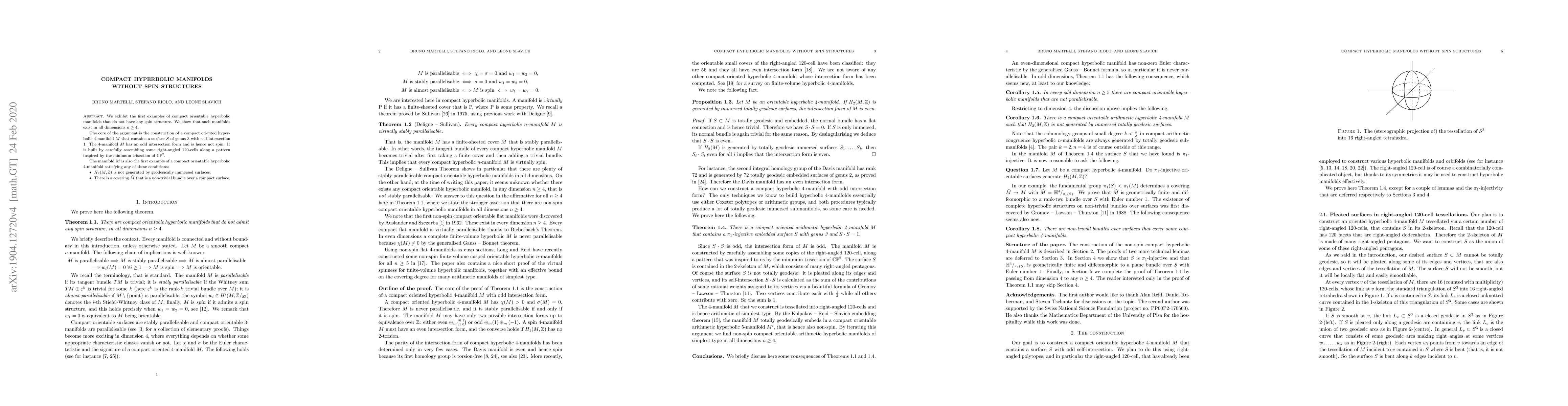 This paper presents the first examples of compact orientable hyperbolic manifolds without spin structures in dimensions $n \geq 4$, constructed by assembling right-angled 120-cells, and highlights a specific $4$-manifold $M$ containing a genus $3$ surface with self-intersection $1$.