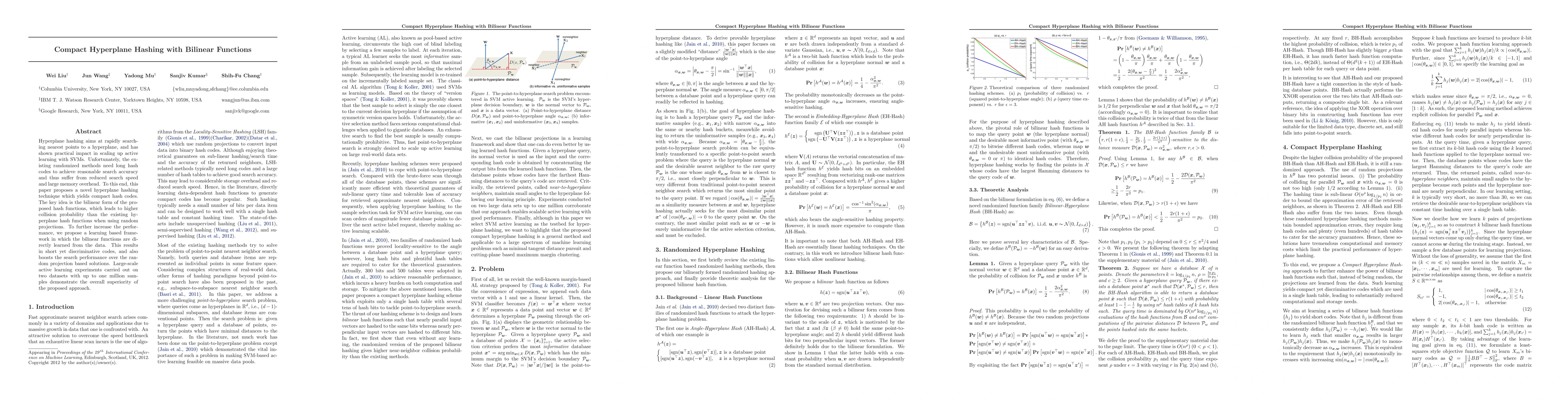 Hyperplane hashing aims at rapidly searching nearest points to a hyperplane, and has shown practical impact in scaling up active learning with SVMs. Unfortunately, the existing randomized methods need long hash codes to achieve reasonable search accuracy and thus suffer from reduced search speed and large memory overhead. To this end, this paper proposes a novel hyperplane hashing technique which yields compact hash codes. The key idea is the bilinear form of the proposed hash functions, which leads to higher collision probability than the existing hyperplane hash functions when using random projections. To further increase the performance, we propose a learning based framework in which the bilinear functions are directly learned from the data. This results in short yet discriminative codes, and also boosts the search performance over the random projection based solutions. Large-scale active learning experiments carried out on two datasets with up to one million samples demonstrate the overall superiority of the proposed approach.