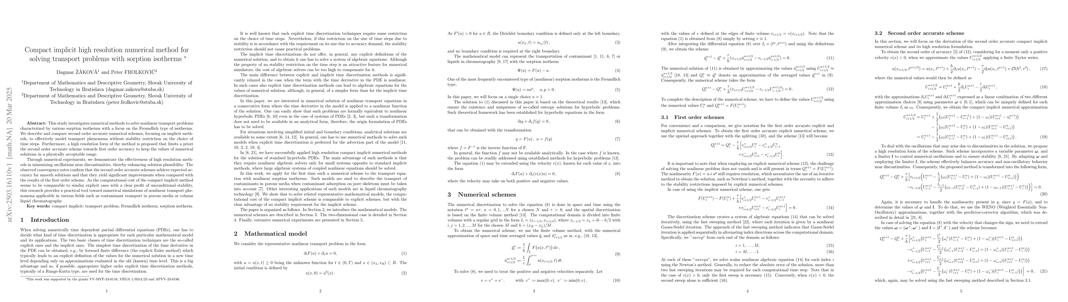 The paper presents a compact implicit high-resolution numerical method for solving transport problems with sorption isotherms, demonstrating its effectiveness in maintaining stability and accuracy without stringent time step restrictions.