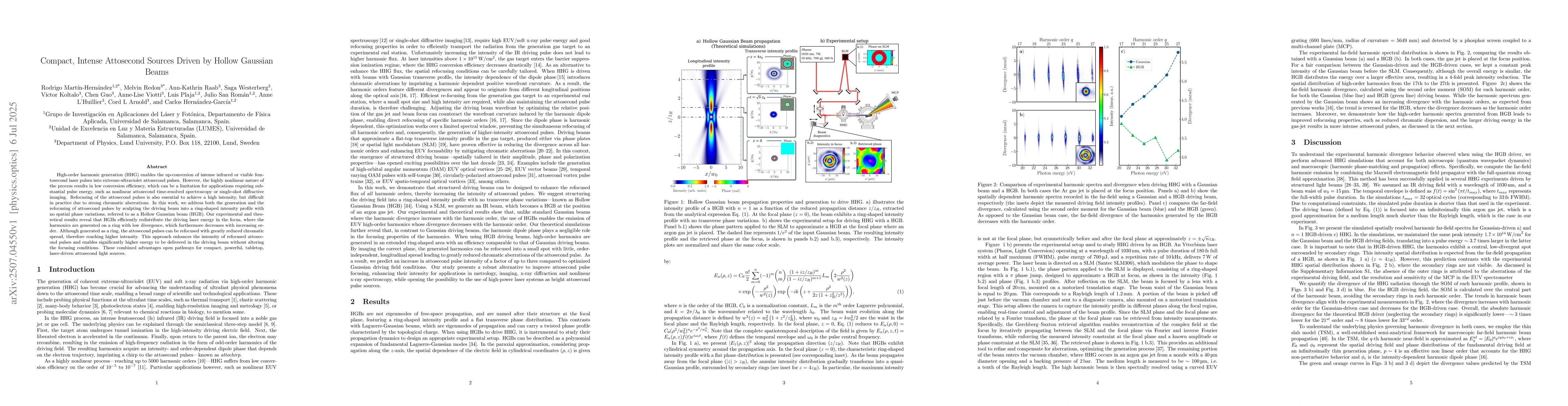High-order harmonic generation (HHG) enables the up-conversion of intense infrared or visible femtosecond laser pulses into extreme-ultraviolet attosecond pulses. However, the highly nonlinear nature of the process results in low conversion efficiency, which can be a limitation for applications requiring substantial pulse energy, such as nonlinear attosecond time-resolved spectroscopy or single-shot diffractive imaging. Refocusing of the attosecond pulses is also essential to achieve a high intensity, but difficult in practice due to strong chromatic aberrations. In this work, we address both the generation and the refocusing of attosecond pulses by sculpting the driving beam into a ring-shaped intensity profile with no spatial phase variations, referred to as a Hollow Gaussian beam (HGB). Our experimental and theoretical results reveal that HGBs efficiently redistribute the driving laser energy in the focus, where the harmonics are generated on a ring with low divergence, which furthermore decreases with increasing order. Although generated as a ring, the attosecond pulses can be refocused with greatly reduced chromatic spread, therefore reaching higher intensity. This approach enhances the intensity of refocused attosecond pulses and enables significantly higher energy to be delivered in the driving beam without altering the focusing conditions. These combined advantages open pathways for compact, powerful, tabletop, laser-driven attosecond light sources.