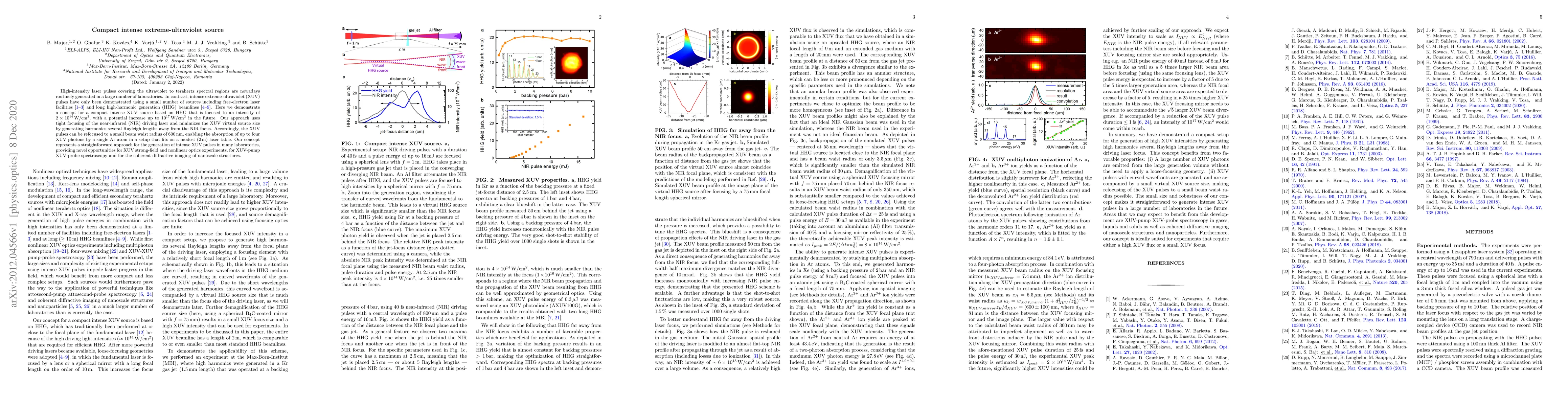 High-intensity laser pulses covering the ultraviolet to terahertz spectral regions are nowadays routinely generated in a large number of laboratories. In contrast, intense extreme-ultraviolet (XUV) pulses have only been demonstrated using a small number of sources including free-electron laser facilities [1-3] and long high-harmonic generation (HHG) beamlines [4-9]. Here we demonstrate a concept for a compact intense XUV source based on HHG that is focused to an intensity of $2 \times 10^{14}$ W/cm$^2$, with a potential increase up to $10^{17}$ W/cm$^2$ in the future. Our approach uses tight focusing of the near-infrared (NIR) driving laser and minimizes the XUV virtual source size by generating harmonics several Rayleigh lengths away from the NIR focus. Accordingly, the XUV pulses can be refocused to a small beam waist radius of 600 nm, enabling the absorption of up to four XUV photons by a single Ar atom in a setup that fits on a modest (2 m) laser table. Our concept represents a straightforward approach for the generation of intense XUV pulses in many laboratories, providing novel opportunities for XUV strong-field and nonlinear optics experiments, for XUV-pump XUV-probe spectroscopy and for the coherent diffractive imaging of nanoscale structures.