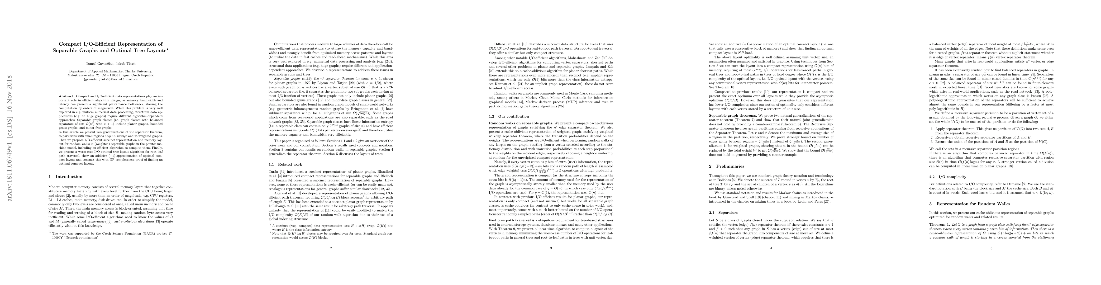 This paper presents I/O-efficient data representations for separable graphs, including a generalized separator theorem and a succinct representation for random walks in these graphs. It also introduces an I/O-optimal tree layout algorithm for root-leaf path traversal, contrasting it with the NP-completeness of finding an optimal layout.
