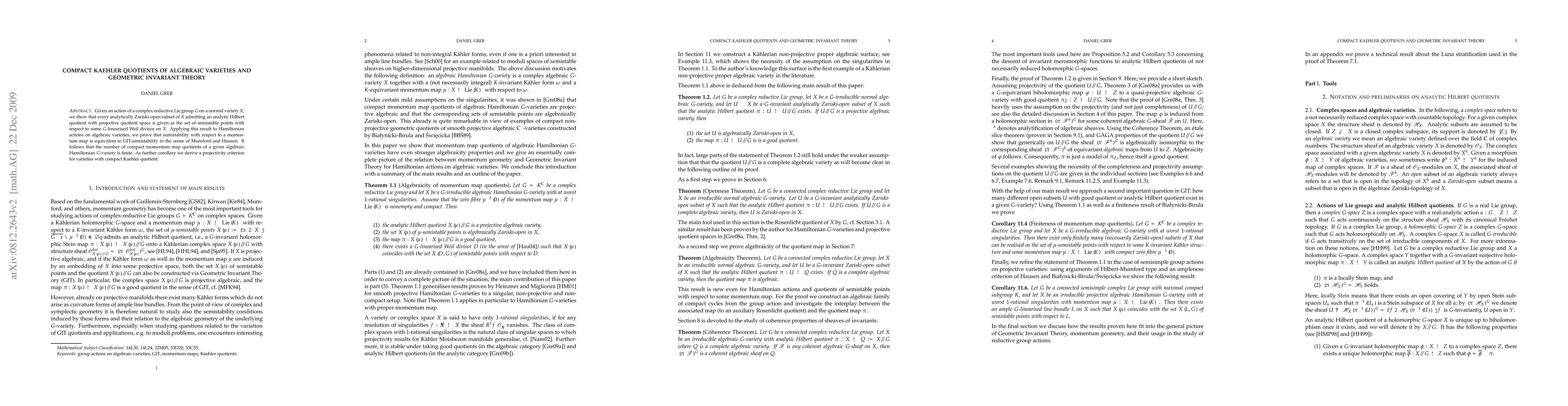 The paper establishes a connection between semistable points in the context of G-linearised Weil divisors and the existence of compact Kaehler quotients in algebraic varieties, proving that the number of such quotients is finite. It also provides a projectivity criterion for varieties with compact Kaehler quotients.