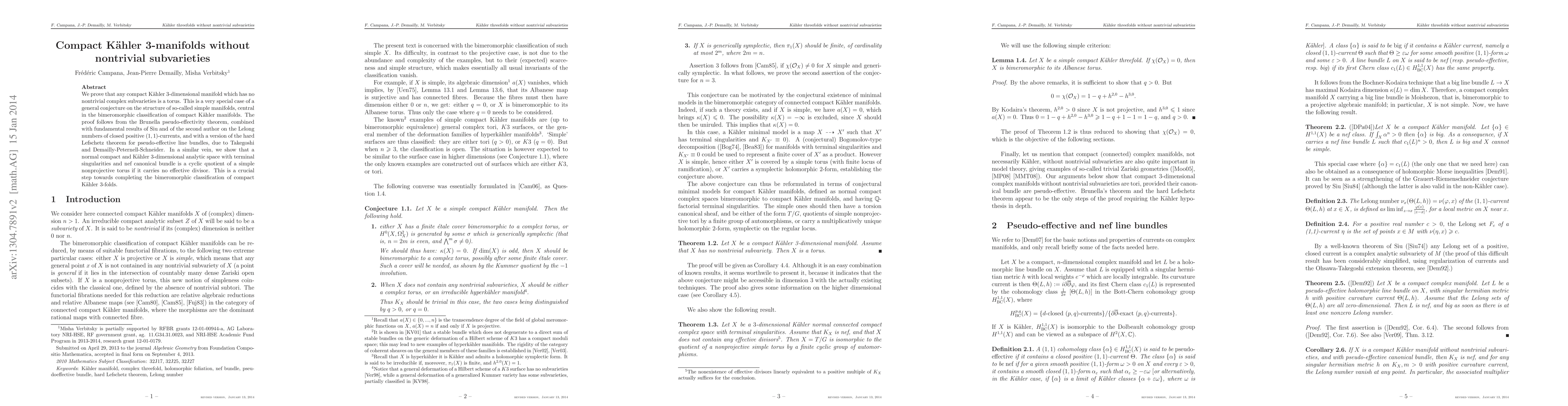 This paper proves that a compact Kähler 3-manifold without non-trivial complex subvarieties is a torus, addressing a special case of a conjecture on 'simple manifolds'. The proof leverages the Brunella pseudo-effectivity theorem, Siu's and the second author's results on Lelong numbers, and a version of the hard Lefschetz theorem. It also extends this result to normal compact Kähler 3-dimensional analytic spaces with terminal singularities and nef canonical bundles.