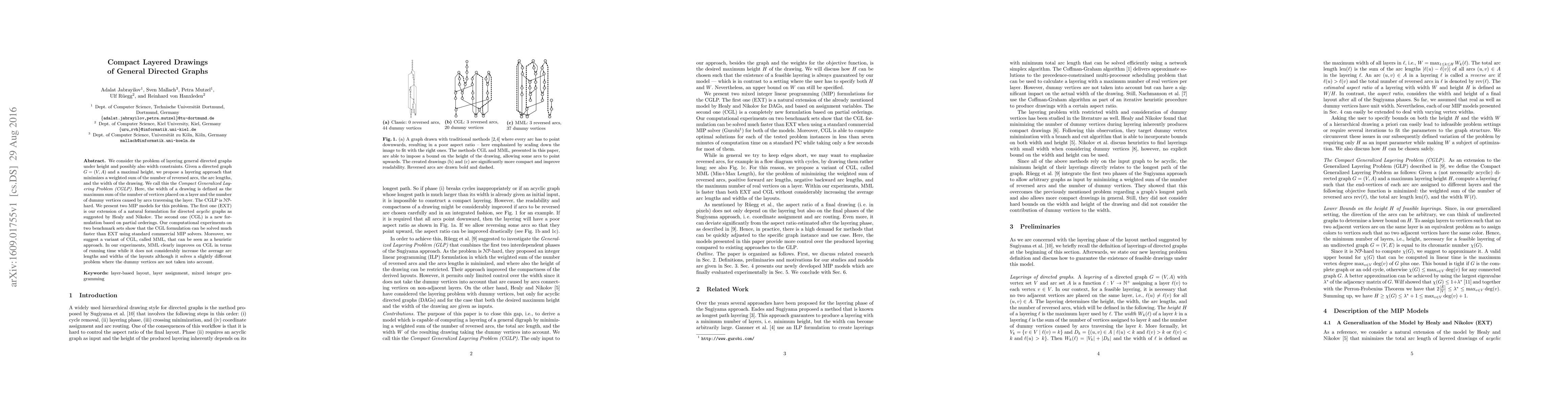 We consider the problem of layering general directed graphs under height and possibly also width constraints. Given a directed graph G = (V,A) and a maximal height, we propose a layering approach that minimizes a weighted sum of the number of reversed arcs, the arc lengths, and the width of the drawing. We call this the Compact Generalized Layering Problem (CGLP). Here, the width of a drawing is defined as the maximum sum of the number of vertices placed on a layer and the number of dummy vertices caused by arcs traversing the layer. The CGLP is NP-hard. We present two MIP models for this problem. The first one (EXT) is our extension of a natural formulation for directed acyclic graphs as suggested by Healy and Nikolov. The second one (CGL) is a new formulation based on partial orderings. Our computational experiments on two benchmark sets show that the CGL formulation can be solved much faster than EXT using standard commercial MIP solvers. Moreover, we suggest a variant of CGL, called MML, that can be seen as a heuristic approach. In our experiments, MML clearly improves on CGL in terms of running time while it does not considerably increase the average arc lengths and widths of the layouts although it solves a slightly different problem where the dummy vertices are not taken into account.