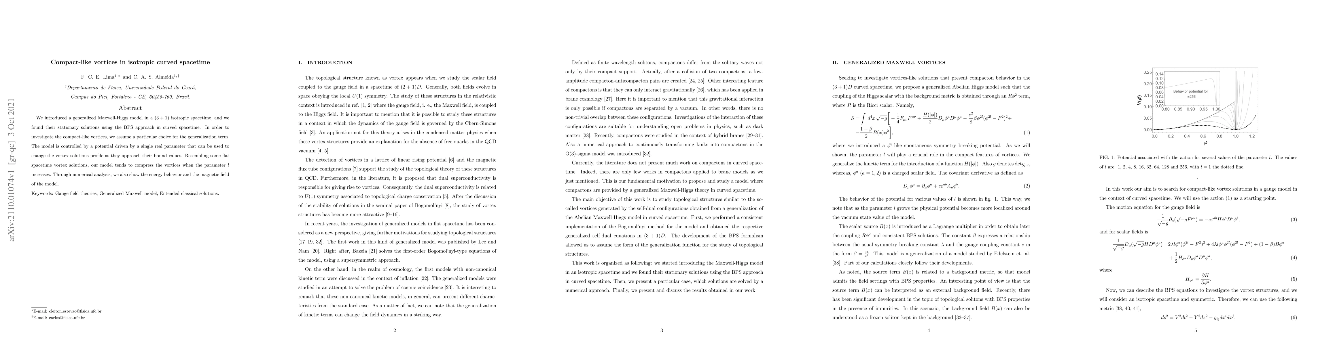 We introduced a generalized Maxwell-Higgs model in a $(3+1)$ isotropic spacetime, and we found their stationary solutions using the BPS approach in curved spacetime. In order to investigate the compact-like vortices, we assume a particular choice for the generalization term. The model is controlled by a potential driven by a single real parameter that can be used to change the vortex solutions profile as they approach their bound values. Resembling some flat spacetime vortex solutions, our model tends to compress the vortices when the parameter $l$ increases. Through numerical analysis, we also show the energy behavior and the magnetic field of the model.