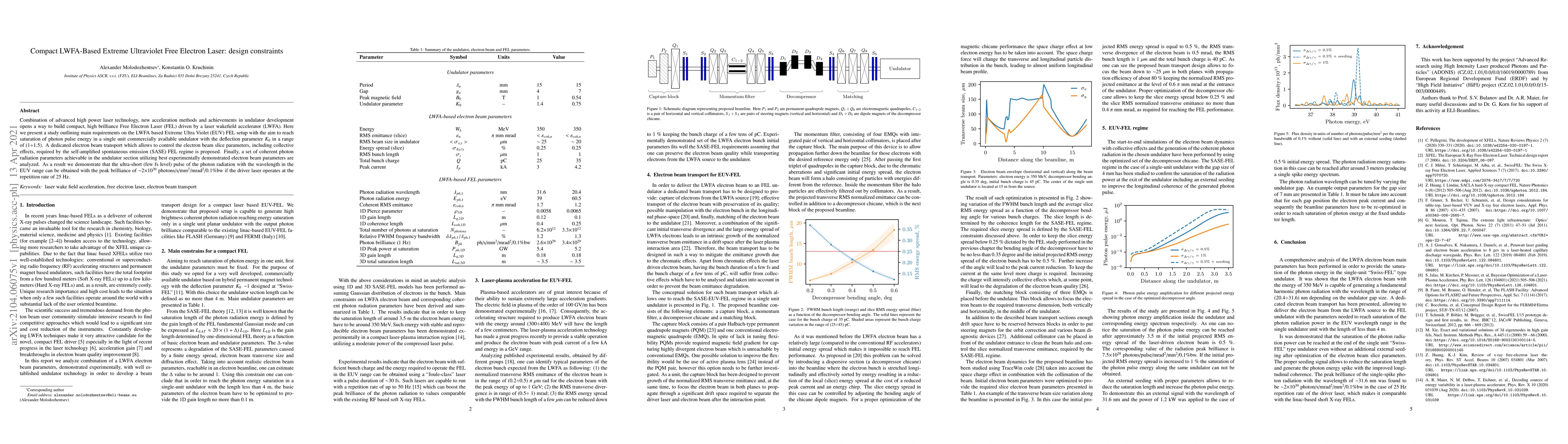 Combination of advanced high power laser technology, new acceleration methods and achievements in undulator development opens a way to build compact, high brilliance Free Electron Laser (FEL) driven by a laser wakefield accelerator (LWFA). Here we present a study outlining main requirements on the LWFA based Extreme Ultra Violet (EUV) FEL setup with the aim to reach saturation of photon pulse energy in a single unit commercially available undulator with the deflection parameter $K_0$ in a range of (1{\div}1.5). A dedicated electron beam transport which allows to control the electron beam slice parameters, including collective effects, required by the self-amplified spontaneous emission (SASE) FEL regime is proposed. Finally, a set of coherent photon radiation parameters achievable in the undulator section utilizing best experimentally demonstrated electron beam parameters are analyzed. As a result we demonstrate that the ultra-short (few fs level) pulse of the photon radiation with the wavelength in the EUV range can be obtained with the peak brilliance of $\sim$2$\times$10$^{30}$ photons/s/mm$^2$/mrad$^2$/0.1%bw if the driver laser operates at the repetition rate of 25 Hz.