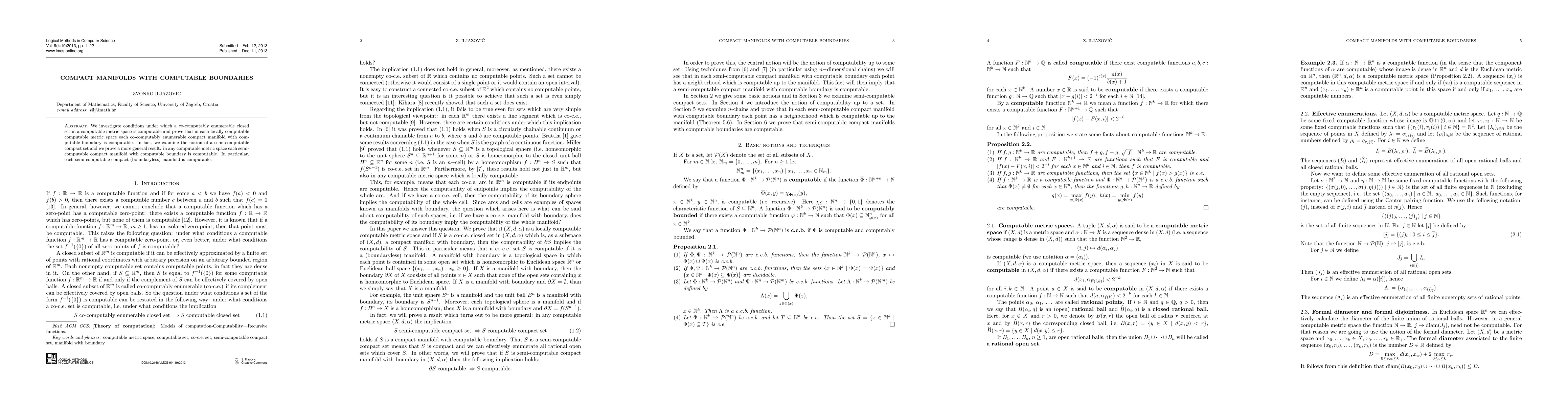 We investigate conditions under which a co-computably enumerable closed set in a computable metric space is computable and prove that in each locally computable computable metric space each co-computably enumerable compact manifold with computable boundary is computable. In fact, we examine the notion of a semi-computable compact set and we prove a more general result: in any computable metric space each semi-computable compact manifold with computable boundary is computable. In particular, each semi-computable compact (boundaryless) manifold is computable.