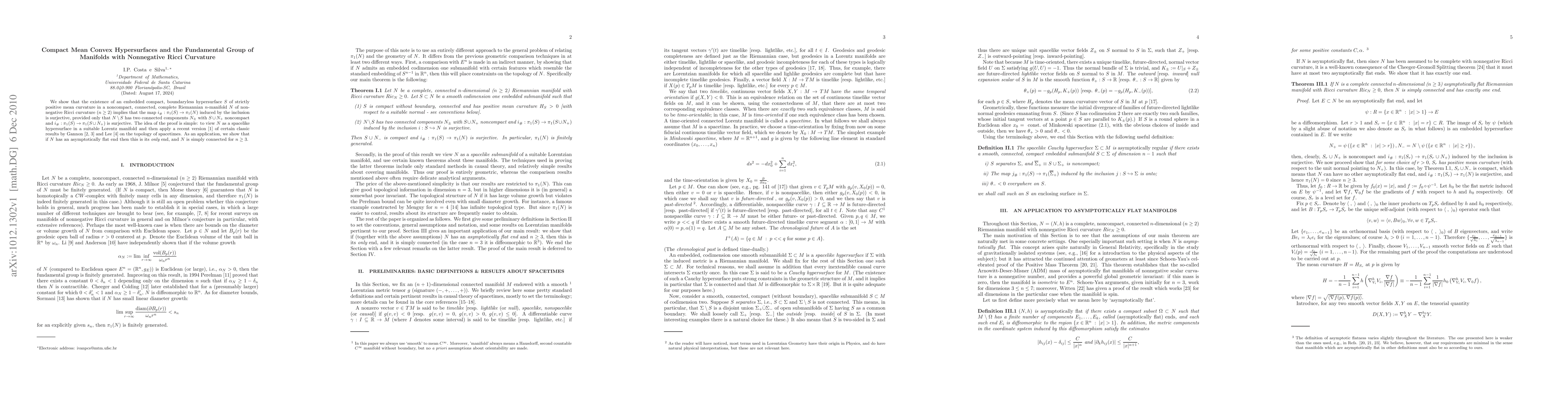 We show that the existence of an embedded compact, boundaryless hypersurface S of strictly positive mean curvature in a noncompact, connected, complete Riemannian n-manifold N of nonnegative Ricci curvature implies that the homomorphism between the fundamental groups of S and N induced by the inclusion is surjective, provided only that N - S has two connected components, one of which has noncompact closure and trivial homotopy relative to S. The idea of the proof is to view N as a spacelike hypersurface in a suitable Lorentz manifold and then apply a recent version of certain classic results by Gannon and Lee on the topology of spacetimes. As an application, we show that if N is asymptotically flat, then it has only one end, and N is simply connected for n larger than 3.
