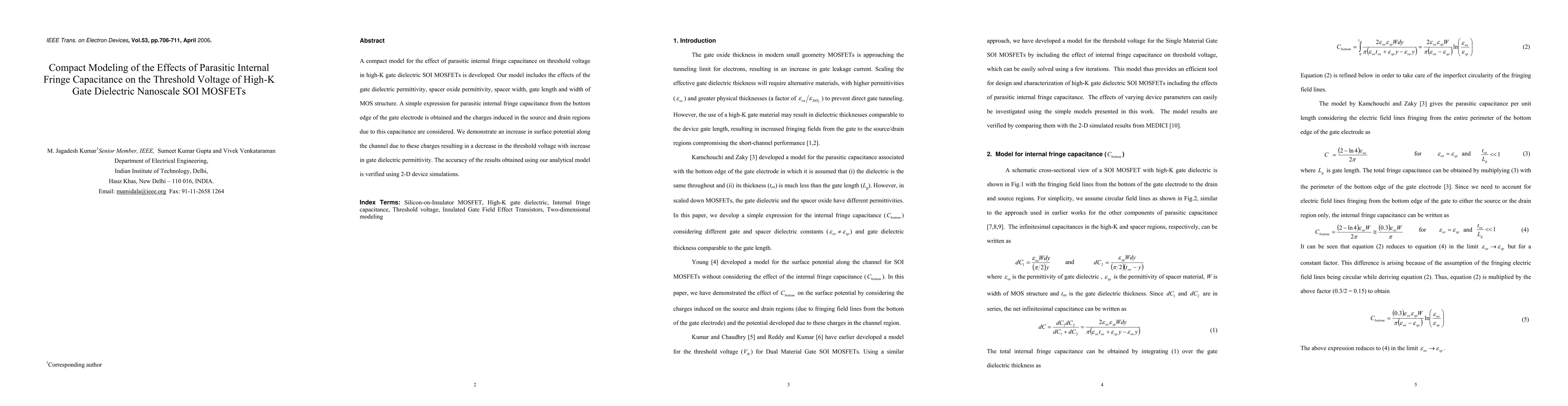 This paper develops a compact model to analyze the impact of parasitic internal fringe capacitance on the threshold voltage in high-K gate dielectric SOI MOSFETs, considering various structural parameters. The model accurately predicts an increase in surface potential and a decrease in threshold voltage with higher gate dielectric permittivity, verified by 2-D device simulations.
