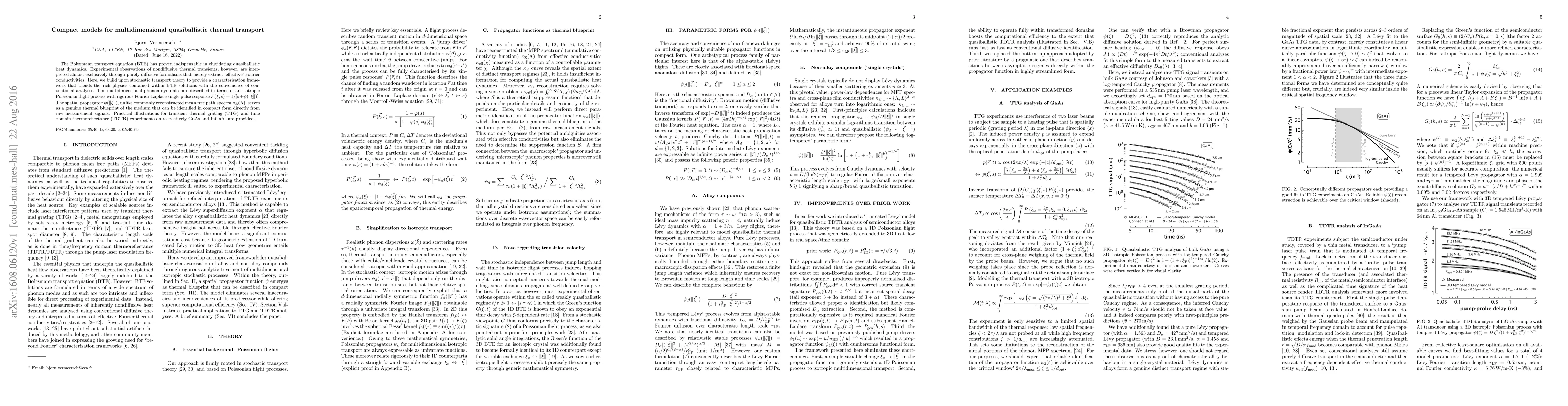 This paper introduces a compact model that combines the Boltzmann transport equation (BTE) with stochastic transport theory to better characterize quasiballistic thermal transport. It presents an isotropic Poissonian flight process for multidimensional phonon dynamics, enabling a direct identification of the spatial propagator from raw measurement signals, illustrated through transient thermal grating and time domain thermoreflectance experiments on GaAs and InGaAs.