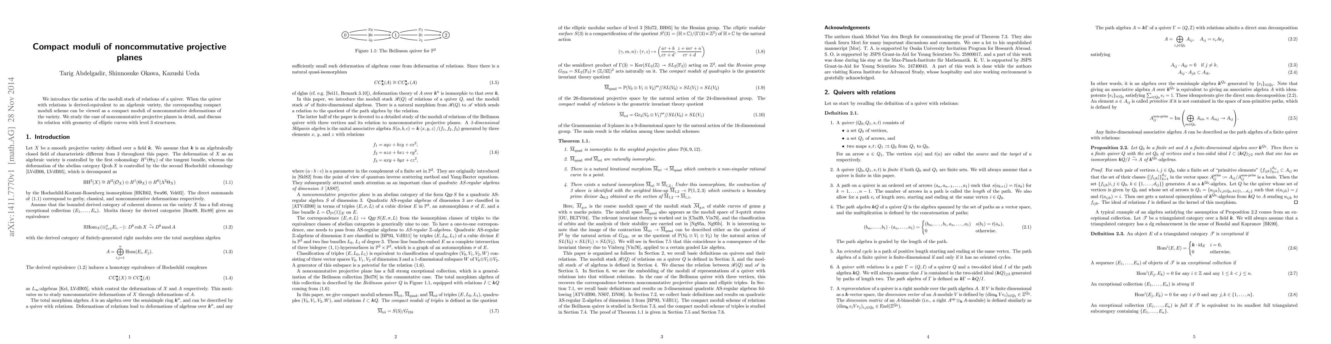 This paper introduces the moduli stack of relations for a quiver, showing that when derived-equivalent to an algebraic variety, it represents a compact moduli of noncommutative deformations. The study focuses on noncommutative projective planes and their connection to the geometry of elliptic curves with level 3 structures.