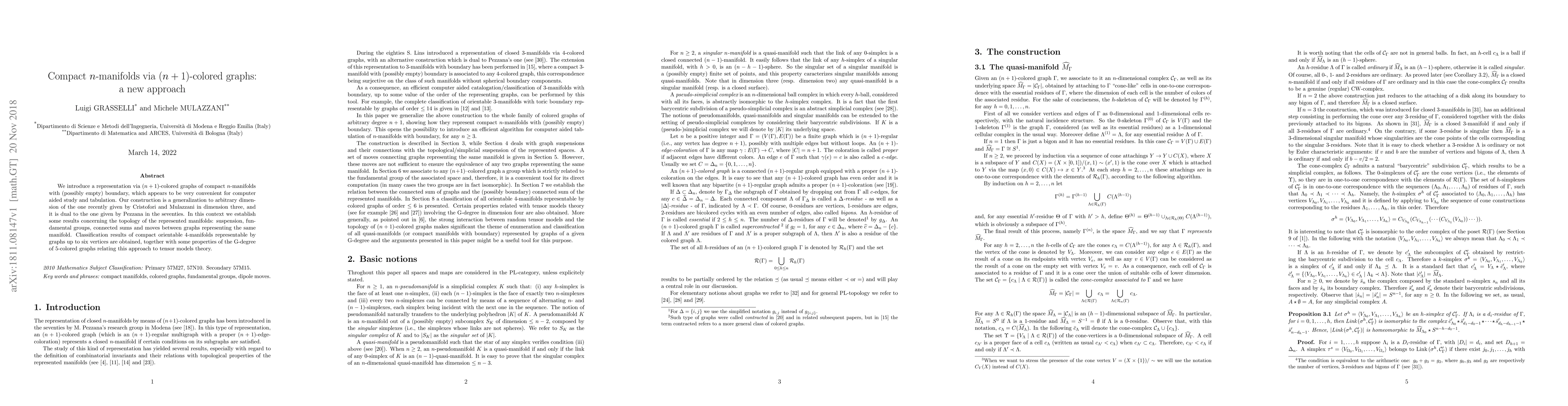 We introduce a representation via (n+1)-colored graphs of compact n-manifolds with (possibly empty) boundary, which appears to be very convenient for computer aided study and tabulation. Our construction is ageneralization to arbitrary dimension of the one recently given by Cristofori and Mulazzani in dimension three, and it is dual to the one given by Pezzana in the seventies. In this context we establish some results concerning the topology of the represented manifolds: suspension, fundamental groups, connected sums and moves between graphs representing the same manifold. Classification results of compact orientable 4-manifolds representable by graphs up to six vertices are obtained, together with some properties of the G-degree of 5-colored graphs relating this approach to tensor models theory.