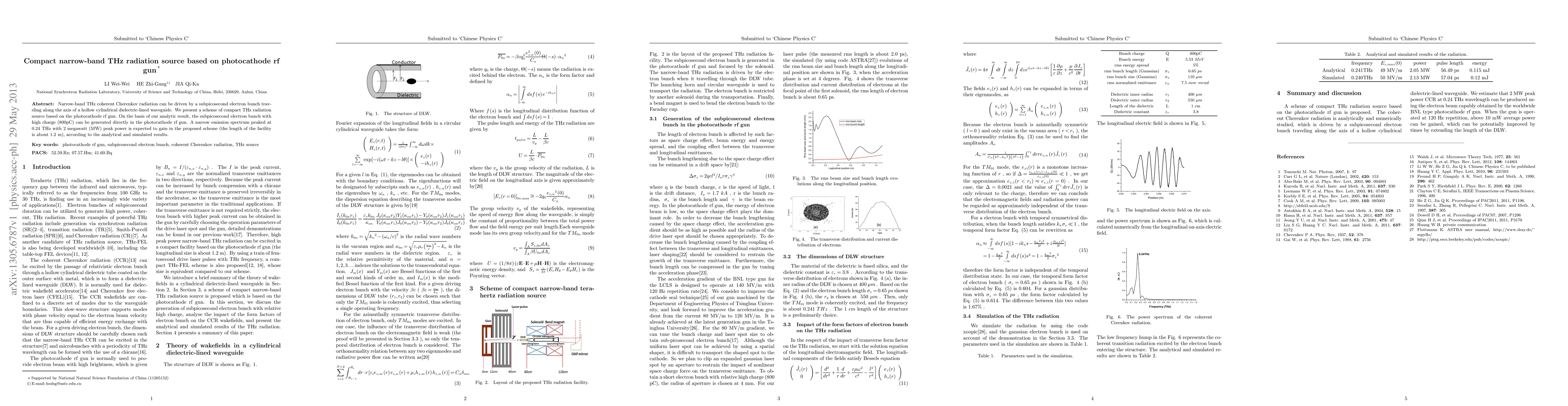 This paper proposes a compact THz radiation source utilizing a photocathode RF gun to generate a subpicosecond electron bunch with high charge (800pC), achieving narrow-band coherent Cherenkov radiation in a dielectric-lined waveguide with a peak emission at 0.24 THz and 2 MW peak power, over a facility length of approximately 1.2 meters.