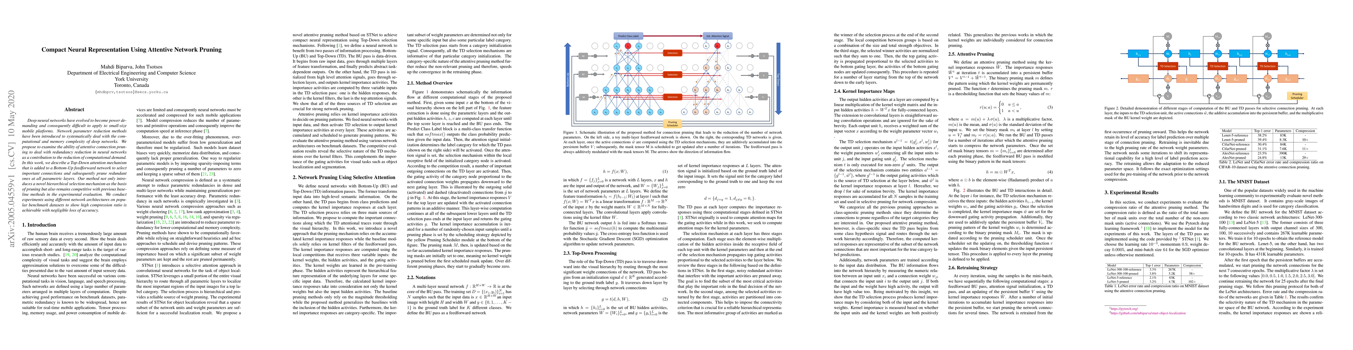 Deep neural networks have evolved to become power demanding and consequently difficult to apply to small-size mobile platforms. Network parameter reduction methods have been introduced to systematically deal with the computational and memory complexity of deep networks. We propose to examine the ability of attentive connection pruning to deal with redundancy reduction in neural networks as a contribution to the reduction of computational demand. In this work, we describe a Top-Down attention mechanism that is added to a Bottom-Up feedforward network to select important connections and subsequently prune redundant ones at all parametric layers. Our method not only introduces a novel hierarchical selection mechanism as the basis of pruning but also remains competitive with previous baseline methods in the experimental evaluation. We conduct experiments using different network architectures on popular benchmark datasets to show high compression ratio is achievable with negligible loss of accuracy.