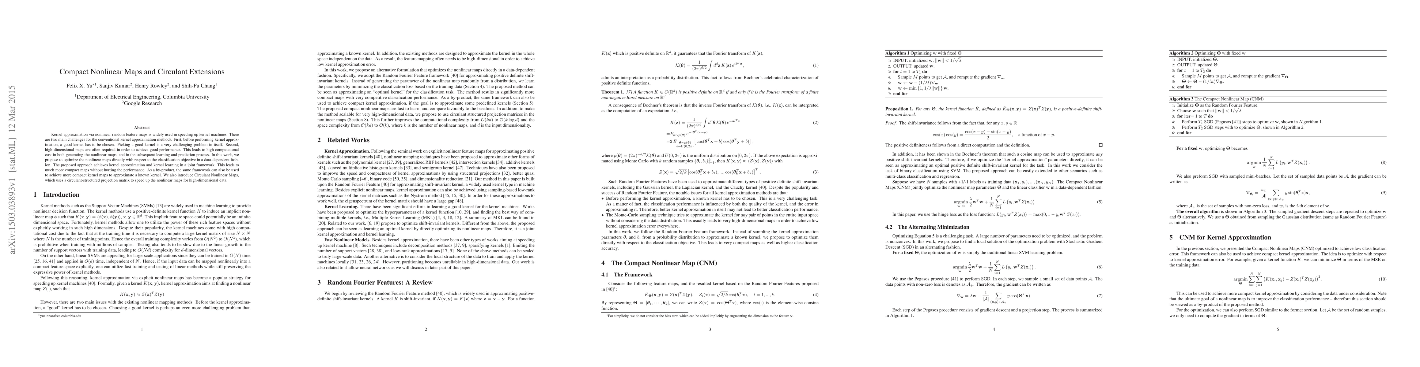 Kernel approximation via nonlinear random feature maps is widely used in speeding up kernel machines. There are two main challenges for the conventional kernel approximation methods. First, before performing kernel approximation, a good kernel has to be chosen. Picking a good kernel is a very challenging problem in itself. Second, high-dimensional maps are often required in order to achieve good performance. This leads to high computational cost in both generating the nonlinear maps, and in the subsequent learning and prediction process. In this work, we propose to optimize the nonlinear maps directly with respect to the classification objective in a data-dependent fashion. The proposed approach achieves kernel approximation and kernel learning in a joint framework. This leads to much more compact maps without hurting the performance. As a by-product, the same framework can also be used to achieve more compact kernel maps to approximate a known kernel. We also introduce Circulant Nonlinear Maps, which uses a circulant-structured projection matrix to speed up the nonlinear maps for high-dimensional data.
