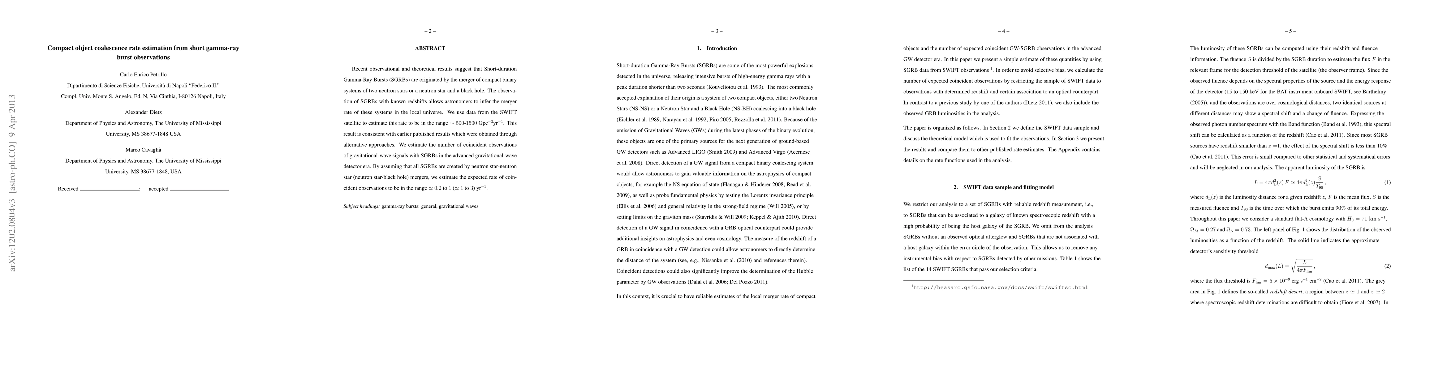 Recent observational and theoretical results suggest that Short-duration Gamma-Ray Bursts (SGRBs) are originated by the merger of compact binary systems of two neutron stars or a neutron star and a black hole. The observation of SGRBs with known redshifts allows astronomers to infer the merger rate of these systems in the local universe. We use data from the SWIFT satellite to estimate this rate to be in the range $\sim 500$-1500 Gpc$^{-3}$yr$^{-1}$. This result is consistent with earlier published results which were obtained through alternative approaches. We estimate the number of coincident observations of gravitational-wave signals with SGRBs in the advanced gravitational-wave detector era. By assuming that all SGRBs are created by neutron star-neutron star (neutron star-black hole) mergers, we estimate the expected rate of coincident observations to be in the range $\simeq 0.2$ to 1 ($\simeq 1$ to 3) yr$^{-1}$.