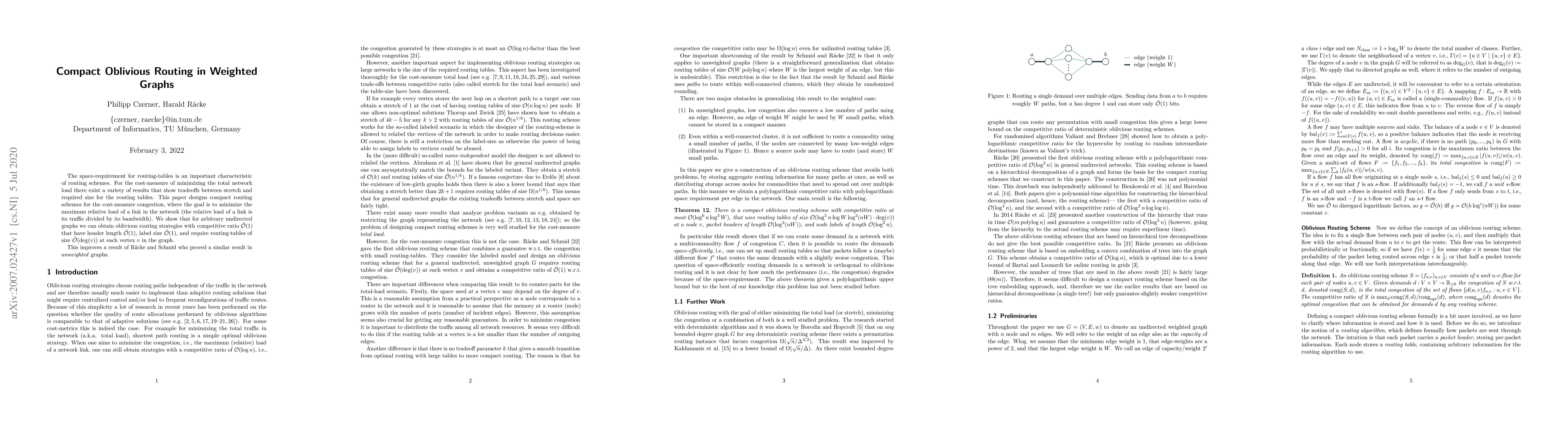This research introduces an improvement over previous work by R\u00e4cke and Schmid by extending compact oblivious routing schemes to arbitrary weighted undirected graphs, achieving similar performance guarantees with smaller routing table sizes.