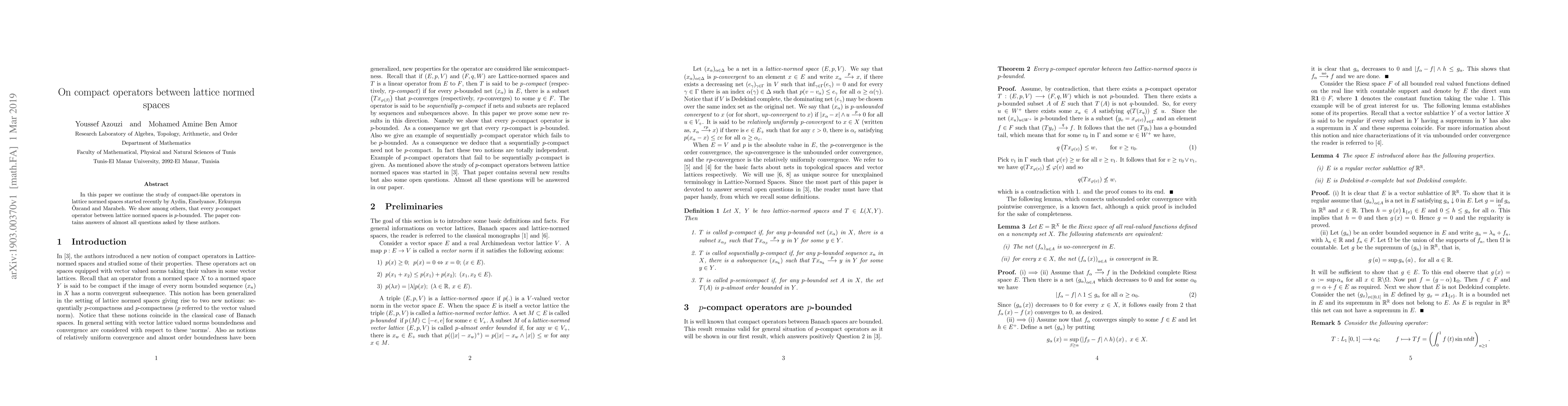 In this paper we continue the study of compact-like operators in lattice normed spaces started recently by Aydin, Emelyanov, Erkur\c{s}un \"Ozcand and Marabeh. We show among others, that every p-compact operator between lattice normed spaces is p-bounded. The paper contains answers of almost all questions asked by these authors.