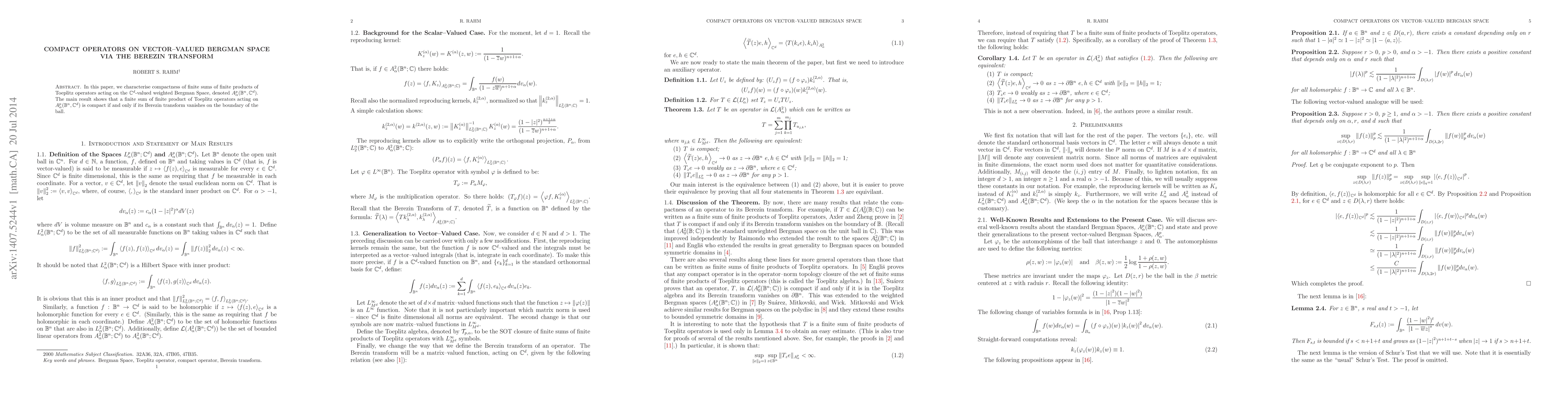 In this paper, we characterise compactness of finite sums of finite products of Toeplitz operators acting on the $\mathbb{C}^{d}$-valued weighted Bergman Space, denoted $A_{\alpha}^{p}(\mathbb{B}_{n},\mathbb{C}^{d})$. The main result shows that a finite sum of finite product of Toeplitz operators acting on $A_{\alpha}^{p}(\mathbb{B}_n,\mathbb{C}_d)$ is compact if and only if its Berezin transform vanishes on the boundary of the ball.