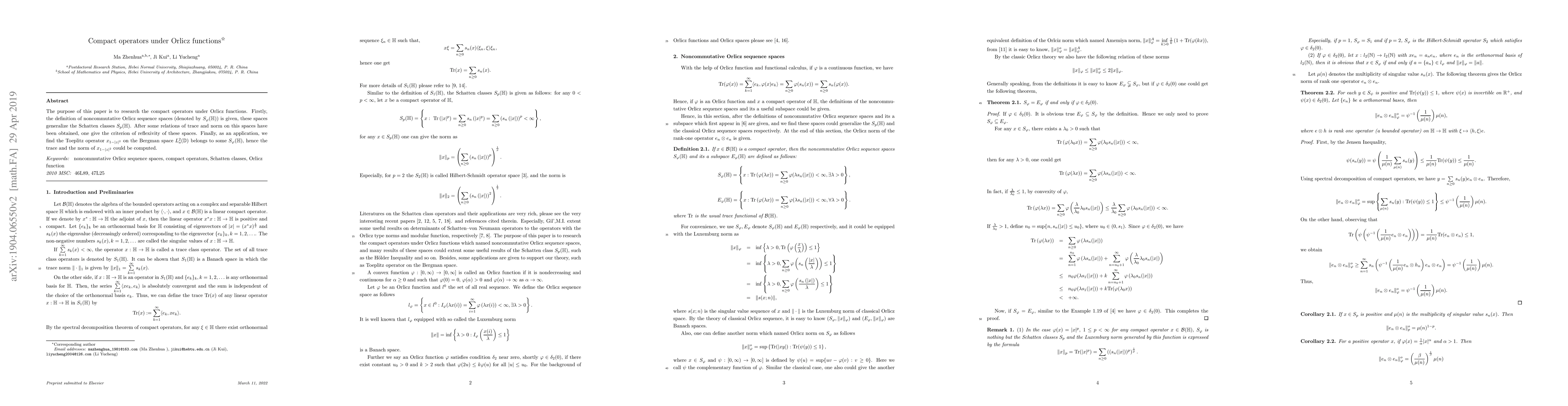 In this paper, the definition of noncommutative Orlicz sequence spaces is given, these spaces generalize the Schatten classes Sp(H). After some relations of trace and norm on this spaces have been researched, one give the criterion of reflexivity of these spaces. At last, as an application, we find the Toeplitz operator on the Bergman space belongs to some noncommutative Orlicz sequence spaces, hence the trace and the norm of operator could be computed.