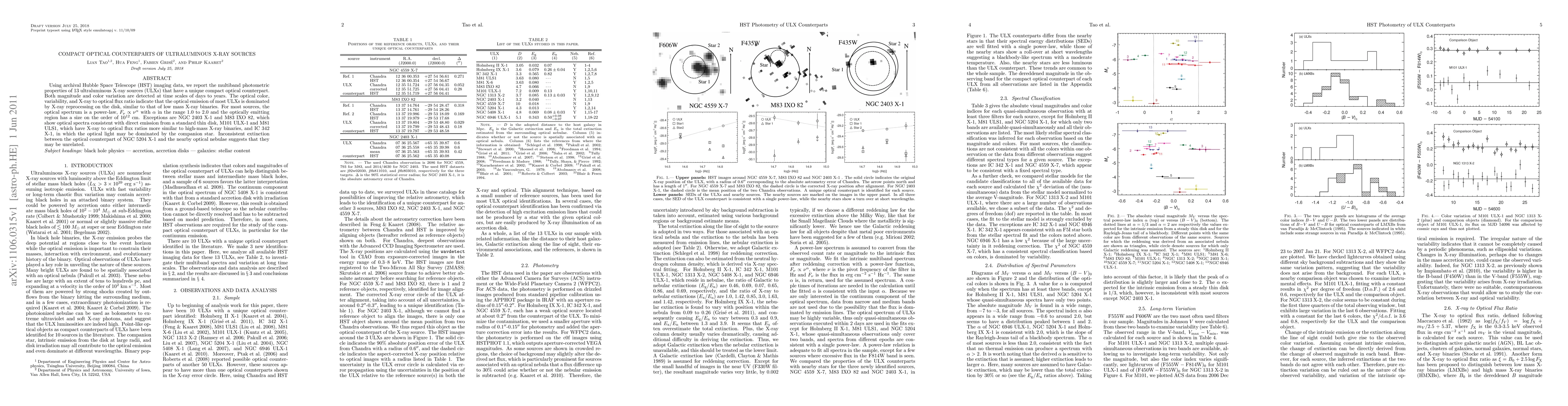 Using archival Hubble Space Telescope (HST) imaging data, we report the multiband photometric properties of 13 ultraluminous X-ray sources (ULXs) that have a unique compact optical counterpart. Both magnitude and color variation are detected at time scales of days to years. The optical color, variability, and X-ray to optical flux ratio indicate that the optical emission of most ULXs is dominated by X-ray reprocessing on the disk, similar to that of low mass X-ray binaries. For most sources, the optical spectrum is a power-law, $F_{\nu} \propto \nu^{\alpha}$ with $\alpha$ in the range 1.0 to 2.0 and the optically emitting region has a size on the order of 1e12 cm. Exceptions are NGC 2403 X-1 and M83 IXO 82, which show optical spectra consistent with direct emission from a standard thin disk, M101 ULX-1 and M81 ULS1, which have X-ray to optical flux ratios more similar to high-mass X-ray binaries, and IC 342 X-1, in which the optical light may be dominated by the companion star. Inconsistent extinction between the optical counterpart of NGC 5204 X-1 and the nearby optical nebulae suggests that they may be unrelated.