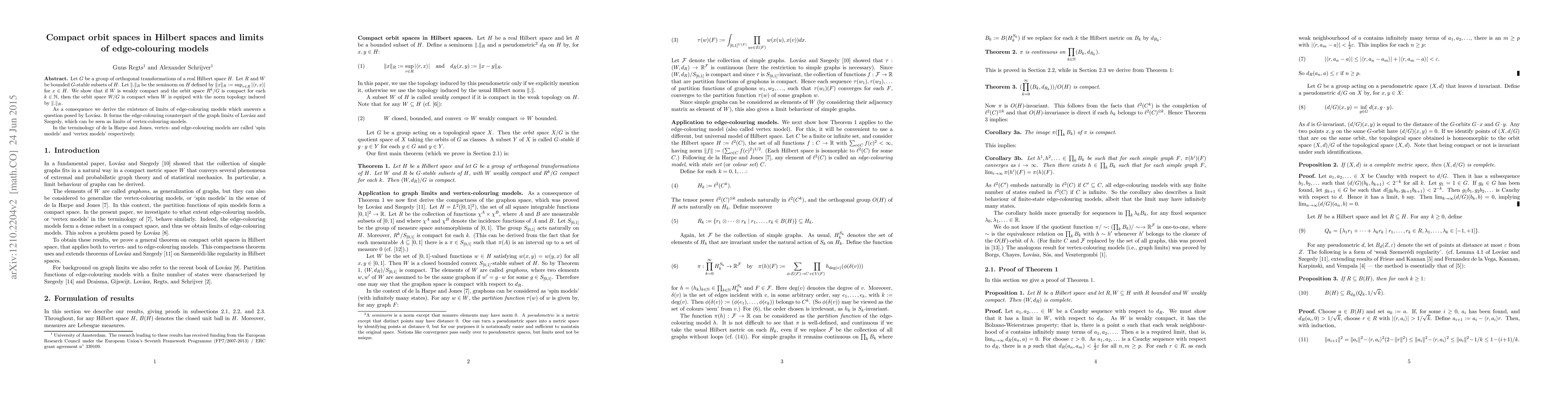 Let $G$ be a group of orthogonal transformations of a real Hilbert space $H$. Let $R$ and $W$ be bounded $G$-stable subsets of $H$. Let $\|.\|_R$ be the seminorm on $H$ defined by $\|x\|_R:=\sup_{r\in R}|\langle r,x\rangle|$ for $x\in H$. We show that if $W$ is weakly compact and the orbit space $R^k/G$ is compact for each $k\in\oN$, then the orbit space $W/G$ is compact when $W$ is equiped with the norm topology induced by $\|.\|_R$. As a consequence we derive the existence of limits of edge-colouring models which answers a question posed by Lov\'asz. It forms the edge-colouring counterpart of the graph limits of Lov\'asz and Szegedy, which can be seen as limits of vertex-colouring models. In the terminology of de la Harpe and Jones, vertex- and edge-colouring models are called `spin models' and `vertex models' respectively.