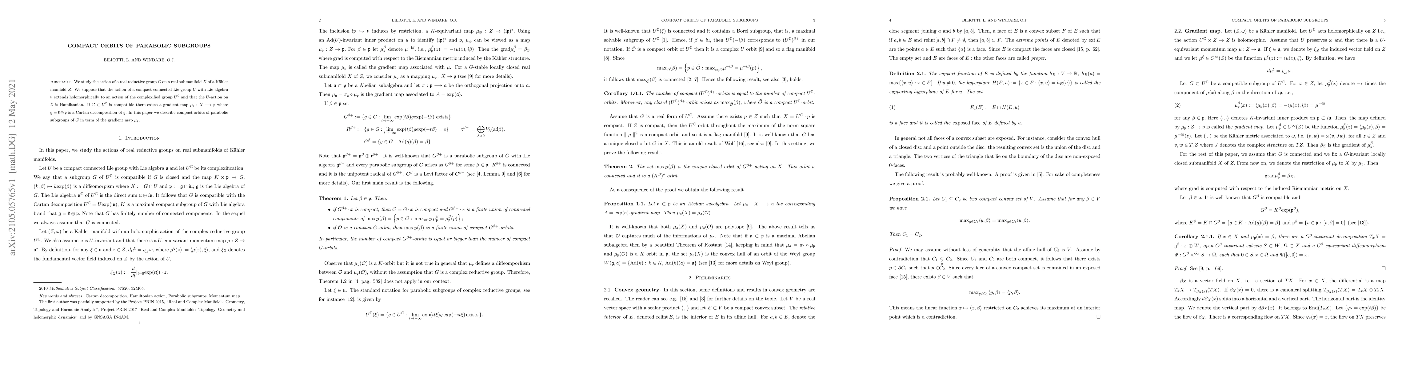 We study the action of a real reductive group $G$ on a real submanifold $X$ of a Kahler manifold $Z$. We suppose that the action of a compact connected Lie group $U$ with Lie algebra $\mathfrak{u}$ extends holomorphically to an action of the complexified group $U^{\mathbb C}$ and that the $U$-action on $Z$ is Hamiltonian. If $G\subset U^{\mathbb C}$ is compatible there exists a gradient map $\mu_{\mathfrak p}:X \longrightarrow \mathfrak p$ where $\mathfrak g=\mathfrak k \oplus \mathfrak p$ is a Cartan decomposition of $\mathfrak g$. In this paper we describe compact orbits of parabolic subgroups of $G$ in term of the gradient map $\mu_\mathfrak p$.