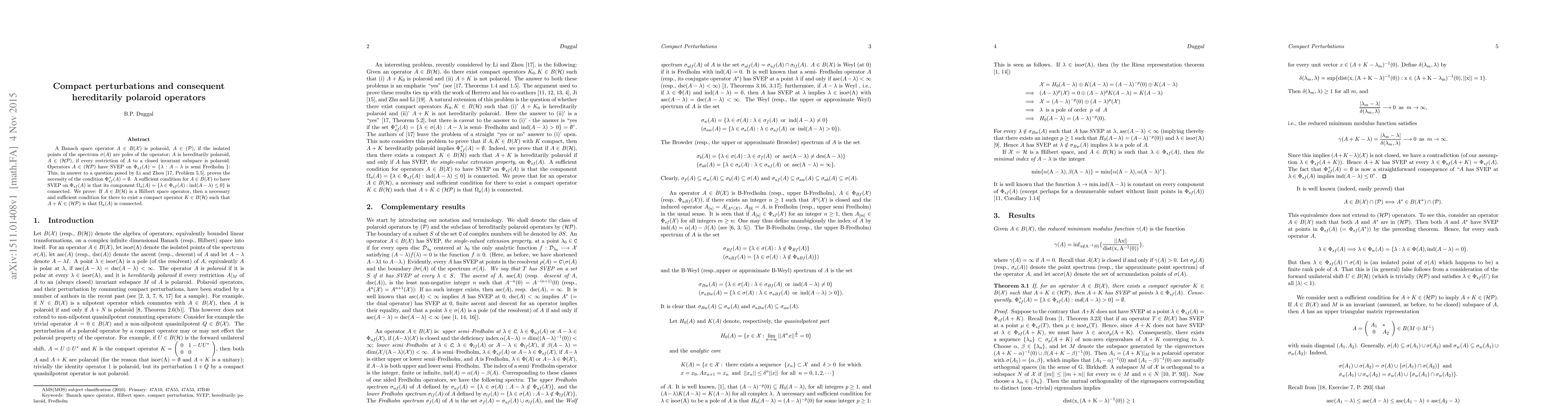 A Banach space operator $A\in B({\cal{X}})$ is polaroid, $A\in {\cal{P}}$, if the isolated points of the spectrum $\sigma(A)$ are poles of the operator; $A$ is hereditarily polaroid, $A\in{\cal{HP}}$, if every restriction of $A$ to a closed invariant subspace is polaroid. Operators $A\in{\cal{HP}}$ have SVEP on $\Phi_{sf}(A)=\{\lambda: A-\lambda$ is semi Fredholm $\}$: This, in answer to a question posed by Li and Zhou (Studia Math. 221(2014), 175-192), proves the necessity of the condition $\Phi_{sf}^+(A)=\emptyset$. A sufficient condition for $A\in B({\cal{X}})$ to have SVEP on $\Phi_{sf}(A)$ is that its component $\Omega_a(A)=\{\lambda\in\Phi_{sf}(A): \rm{ind}(A-\lambda)\leq 0\}$ is connected. We prove: If $A\in B({\cal{H}})$ is a Hilbert space operator, then a necessary and sufficient condition for there to exist a compact operator $K$ such that $A+K\in{\cal{HP}}$ is that $\Omega_a(A)$ is connected.