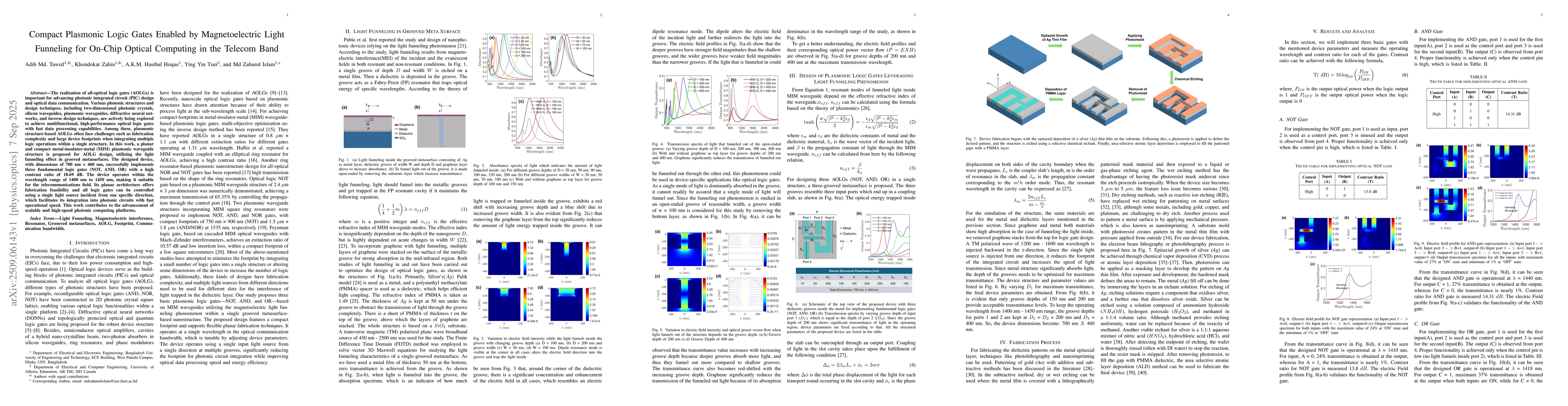 The realization of all-optical logic gates (AOLGs) is important for advancing photonic integrated circuit (PIC) design and optical data communication. Various photonic structures and design techniques, including two-dimensional photonic crystals, silicon waveguides, plasmonic waveguides, diffractive neural networks, and inverse design techniques, are actively being explored to achieve multifunctional, high-performance optical logic gates with fast data processing capabilities. Among these, plasmonic structure-based AOLGs often face challenges such as fabrication complexity and large device footprints when integrating multiple logic operations within a single structure. In this work, a planar and compact metal-insulator-metal (MIM) plasmonic waveguide structure is proposed for AOLG design, utilizing the light funneling effect in grooved metasurfaces. The designed device, with dimensions of 700 nm X 460 nm, successfully implements three fundamental logic gates (NOT, AND, OR) with a high contrast ratio of 18.69 dB. The device operates within the wavelength range of 1400 nm to 1450 nm, making it suitable for the telecommunications field. Its planar architecture offers fabrication feasibility and all logic gates can be controlled using a single light source incident from one specific direction, which facilitates its integration into photonic circuits with fast operational speed. This work contributes to the advancement of scalable and high-speed photonic computing platforms.